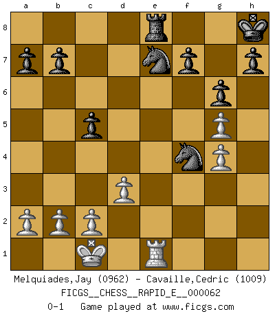 Last move : 0-1 2011 October 17 20:39:19 [Event "FICGS__CHESS__RAPID_E__000062"] [Site "FICGS"] [Date "2011.09.23"] [Round "1"] [White "Melquiades,Jay"] [Black "Cavaille,Cedric"] [Result "0-1"] [WhiteElo "0962"] [BlackElo "1009"] 1.e4 c5 2.Nf3 d6 3.Nc3 Nf6 4.h3 e6 5.d3 Be7 6.Bg5 d5 7.exd5 exd5 8.Ne5 O-O 9.Qf3 Qd6 10.Nxd5 Re8 11.O-O-O Qxe5 12.Re1 Qxg5+ 13.Re3 Qf5 14.Qxf5 Bxf5 15.Nxe7+ Kh8 16.g4 Be6 17.g5 Nh5 18.Bg2 Nc6 19.Rhe1 Rxe7 20.Bf3 g6 21.Bg4 Rae8 22.f4 Bxg4 23.hxg4 Nxf4 24.Rxe7 Nxe7 0-1 Sicilian Kingside Castling by player Black (move 8) Queenside Castling by player White (move 11) Player Black won this chess game. Follow this game move after move (download)A thorough understanding of the typical mating continuations makes the most complicated sacrificial combinations leading up to them not only not difficult, but almost a matter of course. (Siegbert Tarrasch) Ein Teil des Fehlers ist immer korrekt. (Savielly Grigorievitsch Tartakower) El Ajedrez moderno está demasiado preocupado con cosas como la estructura de Peones. Olvidenlo, el Jaque Mate termina la partida. (Nigel Short) Les Echecs représentent une sphère d'idées créatrices basée sur la volonté des deux protagonistes. (Smyslov) Luck is the residue of design. (John Milton)