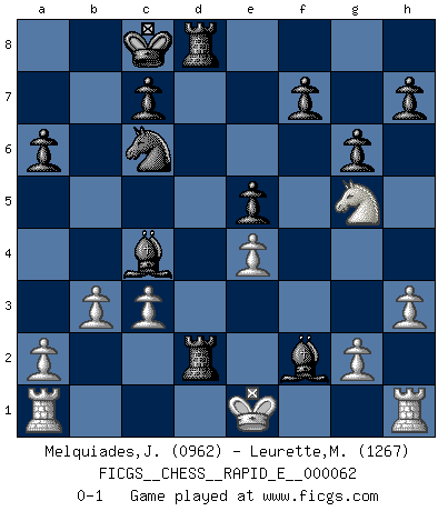Last move : 0-1 2011 October 4 18:1:5 [Event "FICGS__CHESS__RAPID_E__000062"] [Site "FICGS"] [Date "2011.09.23"] [Round "1"] [White "Melquiades,Jay"] [Black "Leurette,Marc-Antoine"] [Result "0-1"] [WhiteElo "0962"] [BlackElo "1267"] 1.e4 e5 2.Nf3 Nc6 3.c3 Nf6 4.Ng5 d5 5.d3 dxe4 6.Nxe4 Nxe4 7.dxe4 Qxd1+ 8.Kxd1 Be6 9.Nd2 O-O-O 10.Bb5 Bc5 11.h3 Rd6 12.Ke2 a6 13.Bxa6 bxa6 14.Nf3 Bc4+ 15.Ke1 Rhd8 16.Bd2 g6 17.Ng5 Rxd2 18.b3 Bxf2+ 0-1 Ponziani : Jaenisch counter-attack Queenside Castling by player Black (move 9) Player Black won this chess game. Follow this game move after move (download)If you aren't afraid of Spassky, then I have removed the element of money. (Jim Slater) Wenn sie aufgeben, dann danke ich Ihnen für das Spiel (Eventualzug beim Fernschach). (Anonymous) El Ajedrez no es como la vida... ¡tiene reglas!. (Mark Pasternak) Les échecs sont plus proches de l'art de l'assassinat que de l'art de la guerre. (Arturo Perez-Reverte) Programming can only do so much before it becomes too much. (Don Groves)