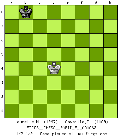 Last move : 1/2-1/2 2011 October 14 21:33:36 [Event "FICGS__CHESS__RAPID_E__000062"] [Site "FICGS"] [Date "2011.09.23"] [Round "1"] [White "Leurette,Marc-Antoine"] [Black "Cavaille,Cedric"] [Result "1/2-1/2"] [WhiteElo "1267"] [BlackElo "1009"] 1.e4 c5 2.Nc3 d6 3.Bb5+ Nc6 4.Bxc6+ bxc6 5.Nf3 Nf6 6.O-O e6 7.d3 Be7 8.Bg5 O-O 9.d4 cxd4 10.Nxd4 d5 11.exd5 cxd5 12.Nc6 Qc7 13.Nxe7+ Qxe7 14.Qf3 Rb8 15.Bxf6 Qxf6 16.Qxf6 gxf6 17.b3 Bb7 18.Rad1 Rfd8 19.Rd4 e5 20.Rg4+ Kh8 21.Re1 d4 22.Ne4 Bxe4 23.Rgxe4 a5 24.a4 Rdc8 25.f4 exf4 26.Rxd4 Rxc2 27.Rxf4 Rb2 28.Rxf6 Kg7 29.Ref1 Rf8 30.R6f5 Rxb3 31.Rxa5 Rfb8 32.Rg5+ Kh6 33.Rgf5 Rb1 34.Rxf7 Rxf1+ 35.Rxf1 Ra8 36.Rf4 Kg5 37.g3 h5 38.h4+ Kg6 39.Kg2 Rb8 40.a5 Rb2+ 41.Rf2 Rb5 42.Ra2 Kf5 43.a6 Rb8 44.a7 Ra8 45.Kf3 Ke5 46.g4 hxg4+ 47.Kxg4 Rg8+ 48.Kh3 Ra8 49.Kg4 Rg8+ 50.Kf3 Rf8+ 51.Ke3 Ra8 52.h5 Kd6 53.h6 Kc7 54.h7 Kb7 55.h8Q Rxh8 56.a8Q+ Rxa8 57.Rxa8 Kxa8 58.Kd4 Kb8 1/2-1/2 Sicilian : Closed Kingside Castling by player White (move 6) Kingside Castling by player Black (move 8) 10 pieces endgame at move 34 : White KRRPPP , Black KRRP WHITE : King + 2 Rooks 3 Pawns BLACK : King + 2 Rooks 1 Pawn 9 pieces endgame at move 34 : White KRPPP , Black KRRP WHITE : King + 1 Rook 3 Pawns BLACK : King + 2 Rooks 1 Pawn 8 pieces endgame at move 35 : White KRPPP , Black KRP WHITE : King + 1 Rook 3 Pawns BLACK : King + 1 Rook 1 Pawn 7 pieces endgame at move 46 : White KRPP , Black KRP WHITE : King + 1 Rook 2 Pawns BLACK : King + 1 Rook 1 Pawn 6 pieces endgame at move 47 : White KRPP , Black KR WHITE : King + 1 Rook 2 Pawns BLACK : King + 1 Rook Promotion Queen by player White (move 55) 5 pieces endgame at move 55 : White KRP , Black KR WHITE : King + 1 Rook 1 Pawn BLACK : King + 1 Rook Promotion Queen by player White (move 56) 4 pieces endgame at move 56 : White KR , Black KR WHITE : King + 1 Rook BLACK : King + 1 Rook 3 pieces endgame at move 57 : White KR , Black K WHITE : King + 1 Rook BLACK : King + 2 pieces endgame at move 57 : White K , Black K WHITE : King + BLACK : King + This chess game ended in a draw. Follow this game move after move (download)In Chess, as it is played by masters, chance is practically eliminated. (Emanuel Lasker) Er war ein guter Schachspieler, aber ich kann Leute nicht ausstehen, die 'Heil Hitler' rufen (Über Alexander Aljechin). (Miguel Najdorf) Una clavada es mas poderosa que una espada. (Fred Reinfeld) Votre prénom est 'Tactique', votre deuxième prénom est 'Tactique' et votre nom est 'Tactique'. (Ken Smith) The difference between perseverance and obstinacy is that one comes from a strong will, and the other from a strong won't. (Henry Ward Beecher)
