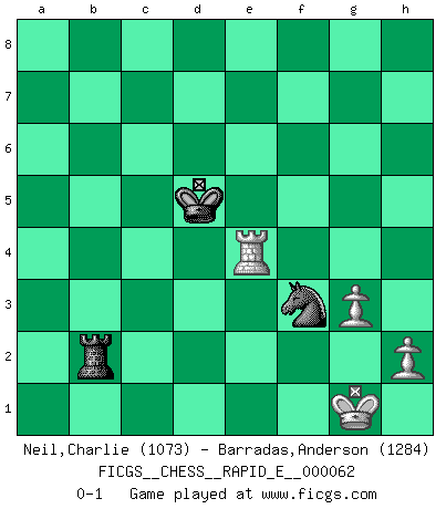 Last move : 0-1 2011 November 6 23:21:32 [Event "FICGS__CHESS__RAPID_E__000062"] [Site "FICGS"] [Date "2011.09.23"] [Round "1"] [White "Neil,Charlie"] [Black "Barradas,Anderson"] [Result "0-1"] [WhiteElo "1073"] [BlackElo "1284"] 1.c4 Nf6 2.d4 e6 3.Nc3 Bb4 4.e3 Ne4 5.Nge2 d5 6.Bd2 Nxd2 7.Qxd2 Nc6 8.Rc1 O-O 9.a3 Bxc3 10.Nxc3 a6 11.cxd5 exd5 12.g3 Ne7 13.Bg2 c6 14.e4 Be6 15.exd5 Nxd5 16.O-O Rc8 17.Ne4 h6 18.Nc5 Rc7 19.Nxe6 fxe6 20.Qd3 Nf6 21.Rfe1 Re8 22.Bh3 Qd7 23.Re5 b6 24.Rce1 Kf7 25.Bxe6+ Rxe6 26.Rxe6 Kf8 27.Qg6 Qf7 28.Qxf7+ Rxf7 29.Rxc6 Rb7 30.R1e6 Nd7 31.b4 h5 32.Rg6 Kf7 33.Rgd6 Ke7 34.Rg6 Kf7 35.Rge6 a5 36.bxa5 bxa5 37.Ra6 g5 38.Rh6 Kg7 39.Rhb6 Nxb6 40.Rxa5 Kg6 41.Ra6 Kf5 42.f3 Nc4 43.Ra4 Ne3 44.Kf2 Nc2 45.Ra5+ Kg6 46.d5 Kf6 47.d6 Ke6 48.Rxg5 Kxd6 49.Rxh5 Nxa3 50.Rh6+ Kc5 51.Rh4 Nc2 52.Re4 Rb2 53.Kg1 Kd5 54.Rf4 Nd4 55.Re4 Nxf3+ 0-1 English, 1...Nf6 (Anglo-Indian defense) Kingside Castling by player Black (move 8) Kingside Castling by player White (move 16) 10 pieces endgame at move 48 : White KRPPPP , Black KRNP WHITE : King + 1 Rook 4 Pawns BLACK : King + 1 Rook 1 Knight 1 Pawn 9 pieces endgame at move 49 : White KRPPPP , Black KRN WHITE : King + 1 Rook 4 Pawns BLACK : King + 1 Rook 1 Knight 8 pieces endgame at move 49 : White KRPPP , Black KRN WHITE : King + 1 Rook 3 Pawns BLACK : King + 1 Rook 1 Knight 7 pieces endgame at move 55 : White KRPP , Black KRN WHITE : King + 1 Rook 2 Pawns BLACK : King + 1 Rook 1 Knight Player Black won this chess game. Follow this game move after move (download)Chess makes man wiser and clear-sighted. (Vladimir Putin) Ich glaube, ich kenne inzwischen die Gründe für mein Versagen: schachliche Charakterfehler. Ich war nie ein Wunderkind und in meiner gesamten menschlichen Entwicklung immer zu langsam. (Viktor Kortschnoi) Fischer sacrificó virtualmente todo lo que la mayoría de nosotros los 'debiles' (término que él usa) valoramos, respetamos y apreciamos por el amor de un astuto, a menudo hermoso tablero de juego, por el privilegio ambivalente de ser su mas grande maestro. (Paul Kollar) Fischer est le meilleur joueur du monde et Karpov n'est qu'un joueur de bistrot. (Garry Kasparov, agé de 16 ans) There is a great deal of difference between an eager man who wants to read a book and a tired man who wants a book to read. (G.K. Chesterton)