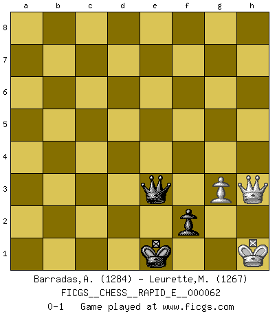 Last move : 0-1 2011 October 3 22:13:13 [Event "FICGS__CHESS__RAPID_E__000062"] [Site "FICGS"] [Date "2011.09.23"] [Round "1"] [White "Barradas,Anderson"] [Black "Leurette,Marc-Antoine"] [Result "0-1"] [WhiteElo "1284"] [BlackElo "1267"] 1.e4 e5 2.Nf3 Nc6 3.d4 exd4 4.Nxd4 Nf6 5.Nc3 Bb4 6.Bd2 Bxc3 7.Bxc3 O-O 8.Be2 d6 9.Bf3 Qe7 10.O-O Nxd4 11.Qxd4 c5 12.Qe3 Be6 13.a3 b6 14.h3 a5 15.e5 Nd5 16.Bxd5 Bxd5 17.Rad1 Bc4 18.Rfe1 d5 19.Qf4 d4 20.Bd2 Bd5 21.Qg3 Qe6 22.c3 dxc3 23.Bxc3 Rfd8 24.b4 Bb3 25.Rxd8+ Rxd8 26.bxc5 bxc5 27.Bxa5 Rd1 28.Rxd1 Bxd1 29.Qd3 Ba4 30.Qd8+ Be8 31.f4 Qd7 32.Qb6 Qd4+ 33.Kh1 Qf2 34.Qd8 Qf1+ 35.Kh2 Qxf4+ 36.Kg1 Qxe5 37.Bc7 Qe3+ 38.Kh2 c4 39.Bb6 Qe2 40.Qc8 Qe6 41.Qc5 h6 42.Qb4 c3 43.Bf2 c2 44.Qc3 Qe2 45.Be3 Bc6 46.Qxc6 Qxe3 47.Qxc2 Qxa3 48.Qc8+ Qf8 49.Qc7 g5 50.Qg3 Qg7 51.Qb8+ Kh7 52.Qb1+ Qg6 53.Qd1 f6 54.Qd7+ Qg7 55.Qd3+ Qg6 56.Qd7+ Kg8 57.Qd8+ Kg7 58.Qc7+ Qf7 59.Qc3 Qd5 60.Qc7+ Kg6 61.Qc2+ f5 62.Kh1 h5 63.Kg1 h4 64.Qe2 Qe4 65.Qa6+ Kf7 66.Qa2+ Qe6 67.Qa7+ Kf6 68.Qa1+ Qe5 69.Qa6+ Qe6 70.Qa1+ Kg6 71.Kh1 g4 72.Qf1 Qe4 73.Qa6+ Kg5 74.Qf1 gxh3 75.Qc1+ f4 76.Qc5+ Kg4 77.Qc8+ Kg3 78.Qxh3+ Kf2 79.Qxh4+ Kf1 80.Qh3 Qe3 81.g3 Ke1 82.Kg2 f3+ 83.Kh1 f2 0-1 Scotch : Schmidt variation Kingside Castling by player Black (move 7) Kingside Castling by player White (move 10) 10 pieces endgame at move 47 : White KQPPP , Black KQPPP WHITE : King + 1 Queen 3 Pawns BLACK : King + 1 Queen 3 Pawns 9 pieces endgame at move 47 : White KQPP , Black KQPPP WHITE : King + 1 Queen 2 Pawns BLACK : King + 1 Queen 3 Pawns 8 pieces endgame at move 74 : White KQP , Black KQPPP WHITE : King + 1 Queen 1 Pawn BLACK : King + 1 Queen 3 Pawns 7 pieces endgame at move 78 : White KQP , Black KQPP WHITE : King + 1 Queen 1 Pawn BLACK : King + 1 Queen 2 Pawns 6 pieces endgame at move 79 : White KQP , Black KQP WHITE : King + 1 Queen 1 Pawn BLACK : King + 1 Queen 1 Pawn Player Black won this chess game. Follow this game move after move (download)Morphy was probably the greatest genius of them all. (Bobby Fischer) Es gibt keine einzige Frau, der ich nicht einen Springer vorgeben könnte und trotzdem gewänne. (Robert James Fischer) Con el tiempo, empecé a progresar en partidas decisivas. Tal vez porque me di cuenta de una simple verdad: no solo estaba yo nervioso sino también mi oponente. (Mikhail Tal) Avec des compensations pour le matériel en plus... (Anonyme) We need strong personalities and only one world champion to attract sponsors. (Anatoly Karpov)