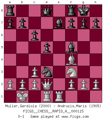 Last move : 0-1 2011 November 11 12:35:46 [Event "FICGS__CHESS__RAPID_A__000115"] [Site "FICGS"] [Date "2011.09.25"] [Round "1"] [White "Muller,Gerdiola"] [Black "Andrucis,Maris"] [Result "0-1"] [WhiteElo "2000"] [BlackElo "1905"] 1.e4 e5 2.Nf3 Nf6 3.Nxe5 d6 4.Nf3 Nxe4 5.Nc3 Nxc3 6.dxc3 Be7 7.Bf4 O-O 8.Qd2 Nd7 9.O-O-O Nc5 10.Bc4 Bf5 11.Kb1 c6 12.Rhe1 d5 13.Bd3 Nxd3 0-1 This chess game has been lost on time (started : 2011.09.25 14:9:35) Petrov : Nimzovich attack Kingside Castling by player Black (move 7) Queenside Castling by player White (move 9) Player Black won this chess game. Follow this game move after move (download)Up to this point White has been following well-known analysis. But now he makes a fatal error: he begins to use his own head. (Siegbert Tarrasch) Ich würde mich als ganz normalen Jungen bezeichnen [Im Alter von 12]. (Sergej Karjakin) El Ajedrez es una manera fabulosa para que los niños aprendan a autovalorarse y a autoestimarse. (Saudin Robovic) Lorsque vous vous retrouvez devant une position atroce, ne tendez pas un ultime piège dérisoire avec l'intention d'abandonner si l'adversaire le déjoue ! Faites-vous plutôt un devoir de résister comme si votre vie en dépendait. Jouez le coup qui vous déplairait au centuple si vous étiez dans la peau de votre tortionnaire ! Always two there are. No more no less. A master, and an apprentice. (Master Yoda in Star Wars ep.1)