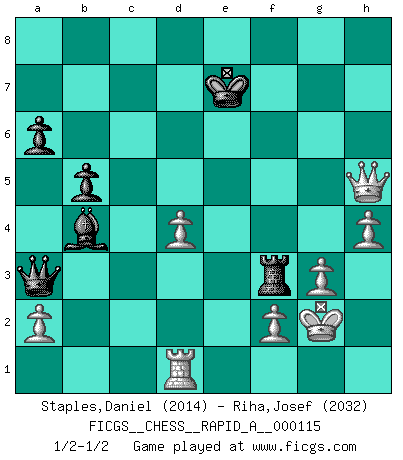 Last move : 1/2-1/2 2011 December 18 22:59:17 [Event "FICGS__CHESS__RAPID_A__000115"] [Site "FICGS"] [Date "2011.09.25"] [Round "1"] [White "Staples,Daniel"] [Black "Riha,Josef"] [Result "1/2-1/2"] [WhiteElo "2014"] [BlackElo "2032"] 1.e4 c5 2.c3 Nf6 3.e5 Nd5 4.d4 cxd4 5.Nf3 e6 6.cxd4 d6 7.Bc4 Nc6 8.O-O Be7 9.Qe2 O-O 10.h3 Bd7 11.Nc3 Nxc3 12.bxc3 d5 13.Bd3 Na5 14.Rb1 Rc8 15.Bd2 b6 16.Nh2 Nc4 17.Qh5 g6 18.Qe2 Nxd2 19.Qxd2 Ba4 20.Ba6 Rc7 21.Ng4 h5 22.Ne3 Qd7 23.Qd3 Kh7 24.Rfc1 f6 25.exf6 Bxf6 26.Rb4 Bc6 27.Re1 Qd6 28.R4b1 Bd7 29.Bb5 Bc8 30.Rb2 Kg7 31.Rbe2 Bd8 32.Qd2 Qa3 33.Nd1 Rf5 34.Ne3 Rf6 35.Rc1 Rf8 36.Bd3 Bd7 37.Nd1 Rc8 38.Re1 Rf6 39.g3 Be7 40.h4 Bb4 41.Re5 Ba4 42.Rg5 b5 43.Qe3 Bxd1 44.Bxg6 Rxg6 45.Rxg6+ Kxg6 46.Qxe6+ Kg7 47.Qe5+ Kf8 48.Qf5+ Ke7 49.Rxd1 Rxc3 50.Qxd5 Rf3 51.Qxh5 a6 52.Kg2 1/2-1/2 Sicilian : Alapin's variation (2.c3) Kingside Castling by player White (move 8) Kingside Castling by player Black (move 9) This chess game ended in a draw. Follow this game move after move (download)Chess, like love, is infectious at any age. (Flohr) Sie bekommen vielleicht den Eindruck, dass die Spitzenspieler überhaupt gar nicht so stark sind. Aber das stimmt nicht. Es ist eine Illusion. Mit einem Computer an der Seite ist es sehr leicht, Urteile zu fällen, aber wenn man alleine am Brett sitzt, sieht die Sache ganz anders aus. (Vladimir Kramnik) El Ajedrez es realmente noventa y nueve por ciento calculación. (Soltis) On croit qu'il y a plus de mauvais joueurs que de bons joueurs, c'est faux : Il y a autant de joueurs qui gagnent que de joueurs qui perdent. (Philippe Geluck) If you lose the game you should win the analysis! (Proverb)