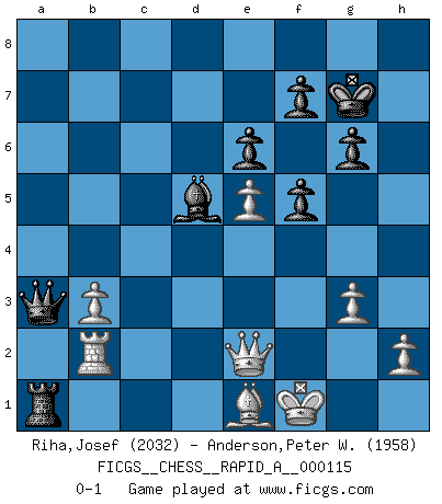 Last move : 0-1 2011 October 8 12:14:32 [Event "FICGS__CHESS__RAPID_A__000115"] [Site "FICGS"] [Date "2011.09.25"] [Round "1"] [White "Riha,Josef"] [Black "Anderson,Peter W."] [Result "0-1"] [WhiteElo "2032"] [BlackElo "1958"] 1.e4 g6 2.d4 Bg7 3.Nc3 d6 4.f4 a6 5.Nf3 b5 6.Bd3 Nd7 7.e5 c5 8.Be3 b4 9.Ne4 Nh6 10.Neg5 cxd4 11.Bxd4 dxe5 12.fxe5 e6 13.O-O Nf5 14.Bxf5 gxf5 15.Qe1 a5 16.Nh3 O-O 17.Nf4 Kh8 18.Nh5 Rg8 19.Nxg7 Rxg7 20.c3 Bb7 21.Rc1 Qe7 22.Qe3 Rag8 23.Rc2 Rg4 24.R1f2 Be4 25.Rcd2 Bd5 26.cxb4 axb4 27.Qh6 R4g6 28.Qe3 Bxa2 29.b3 Bb1 30.Ne1 Be4 31.Bb2 Nc5 32.Bd4 Na6 33.g3 Nc7 34.Bc5 Qh4 35.Ng2 Qh5 36.Be7 Nd5 37.Rxd5 Bxd5 38.Nh4 Ra8 39.Nxg6+ hxg6 40.Bxb4 Ra1+ 41.Rf1 Ra2 42.Rf2 Qd1+ 43.Qe1 Qd4 44.Bc3 Qb6 45.Kf1 Ra3 46.Rb2 Kg7 47.Bb4 Qa6+ 48.Qe2 Ra1+ 49.Be1 Qa3 0-1 Robatsch defense : Pseudo-Austrian attack Kingside Castling by player White (move 13) Kingside Castling by player Black (move 16) Player Black won this chess game. Follow this game move after move (download)Combinations have always been the most intriguing aspect of Chess. The masters look for them, the public applauds them, the critics praise them. It is because combinations are possible that Chess is more than a lifeless mathematical exercise. They are the poetry of the game; they are to Chess what melody is to music. They represent the triumph of mind over matter. (Reuben Fine) Du musst nicht gut spielen, es reicht, wenn du besser spielst als dein Gegner. (Anonymous) Todos los Maestros de Ajedrez fueron un día unos principiantes. (Chernev) Soyez une menace à chaque fois que vous vous asseyez pour jouer. (Ken Smith) Life is verb, not a noun. (Charlotte Perkins Gilman)