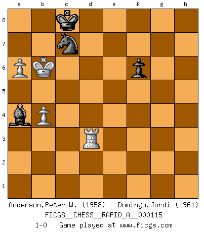 Last move : 1-0 2012 January 23 18:33:36 [Event "FICGS__CHESS__RAPID_A__000115"] [Site "FICGS"] [Date "2011.09.25"] [Round "1"] [White "Anderson,Peter W."] [Black "Domingo,Jordi"] [Result "1-0"] [WhiteElo "1958"] [BlackElo "1961"] 1.d4 d5 2.c4 dxc4 3.e4 e5 4.Nf3 exd4 5.Bxc4 Nc6 6.O-O Be6 7.Bb5 Bc5 8.b4 Bb6 9.a4 a6 10.Bxc6+ bxc6 11.a5 Ba7 12.Bb2 Nf6 13.Bxd4 Nxe4 14.Bxa7 Qxd1 15.Rxd1 Rxa7 16.Ne5 Rb7 17.Nxc6 Nd6 18.Nc3 Kd7 19.Ne5+ Kc8 20.Rac1 f6 21.Nc6 Re8 22.f3 Kd7 23.Na4 Bf7 24.h4 h6 25.Kf2 g5 26.hxg5 hxg5 27.g4 Bg8 28.Rd2 Bf7 29.Rdc2 Nb5 30.Rh1 Bg6 31.R2c1 Nd6 32.Rh6 Rg8 33.Kg3 Rb5 34.R6h1 Rd5 35.Rhe1 Re8 36.Rxe8 Bxe8 37.Nb8+ Kd8 38.Nc5 Kc8 39.Nbxa6 Bb5 40.Ne6 Bxa6 41.Nxc7 Rd1 42.Rxd1 Kxc7 43.Rh1 Kc6 44.Rh6 Ne8 45.f4 gxf4+ 46.Kxf4 Kb5 47.Rh7 Kc6 48.Rf7 Bc4 49.Rf8 Kd7 50.Ke4 Ke7 51.Rh8 Nc7 52.Kd4 Be2 53.Rh2 Bxg4 54.Kc5 Bd7 55.Re2+ Kd8 56.Rb2 Kc8 57.Kb6 Nd5+ 58.Ka7 Nc7 59.a6 Bc6 60.Rc2 Kd7 61.Rd2+ Kc8 62.Kb6 Ba4 63.Rd3 1-0 This chess game has been lost on time (started : 2011.09.25 14:9:35) QGA : 3.e4 Kingside Castling by player White (move 6) 10 pieces endgame at move 45 : White KRPPP , Black KBNPP WHITE : King + 1 Rook 3 Pawns BLACK : King + 1 Bishop 1 Knight 2 Pawns 9 pieces endgame at move 46 : White KRPPP , Black KBNP WHITE : King + 1 Rook 3 Pawns BLACK : King + 1 Bishop 1 Knight 1 Pawn 8 pieces endgame at move 53 : White KRPP , Black KBNP WHITE : King + 1 Rook 2 Pawns BLACK : King + 1 Bishop 1 Knight 1 Pawn Player White won this chess game. Follow this game move after move (download)I'd rather have a Pawn than a finger. (Reuben Fine) Es war undenkbar für die Behörden, dass ein sowjetischer Großmeister auf diese Art und Weise [Fischer-Taimanov 6:0] verliert, ohne dass es eine politischer Erklärung dafür gäbe. (Mark Taimanov) El Ajedrez hace al hombre ser mas sabio y ver mas claro. (Vladimir Putin) J'apprécie les joueurs d'est-indienne, c'est grâce à eux que je nourris ma famille depuis tant d'années. (Petrosian) No enterprise is more likely to succeed than one concealed from the enemy until it is ripe for execution. (Niccolo Machiavelli)