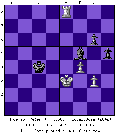 Last move : 1-0 2012 February 13 7:22:57 [Event "FICGS__CHESS__RAPID_A__000115"] [Site "FICGS"] [Date "2011.09.25"] [Round "1"] [White "Anderson,Peter W."] [Black "Lopez,Jose"] [Result "1-0"] [WhiteElo "1958"] [BlackElo "2042"] 1.d4 d5 2.c4 e6 3.Nc3 c6 4.Nf3 dxc4 5.a4 Bb4 6.e4 b5 7.Bd2 a5 8.axb5 Bxc3 9.bxc3 cxb5 10.Qb1 Ba6 11.g3 Ne7 12.Bg2 Nbc6 13.O-O O-O 14.Rd1 a4 15.d5 exd5 16.exd5 Nxd5 17.Ng5 g6 18.Ne4 Qc7 19.Bg5 f6 20.Bh6 Nce7 21.Bxf8 Rxf8 22.Qb2 Kg7 23.Qa3 Rd8 24.Qc5 Qxc5 25.Nxc5 Bc8 26.Rd4 Bf5 27.Re1 Kf7 28.Red1 Be6 29.f4 a3 30.Kf2 a2 31.Ra1 Rc8 32.Ne4 Nf5 33.Rd2 b4 34.Rdxa2 Nxc3 35.Ra7+ Kf8 36.Nxc3 bxc3 37.Rc1 Rd8 38.Ra8 Rxa8 39.Bxa8 Ke7 40.Rxc3 Kd6 41.Be4 Nd4 42.Ra3 Kc5 43.Ke3 Nf5+ 44.Bxf5 Bxf5 45.Ra6 c3 46.Rxf6 c2 47.Kd2 Kd5 48.Rf7 h5 49.Re7 Kd4 50.Re8 Kd5 51.Re5+ Kd4 52.h3 Bxh3 53.Kxc2 Bf5+ 54.Kd2 Bb1 55.Ke2 Be4 56.Kf2 Ba8 57.Re6 Be4 58.Rd6+ Kc5 59.Rd8 Bf5 60.Ke3 Kc4 61.Re8 1-0 This chess game has been lost on time (started : 2011.09.25 14:9:35) QGD : Semi-Slav, Noteboom variation Kingside Castling by player White (move 13) Kingside Castling by player Black (move 13) 10 pieces endgame at move 46 : White KRPPP , Black KBPPP WHITE : King + 1 Rook 3 Pawns BLACK : King + 1 Bishop 3 Pawns 9 pieces endgame at move 52 : White KRPP , Black KBPPP WHITE : King + 1 Rook 2 Pawns BLACK : King + 1 Bishop 3 Pawns 8 pieces endgame at move 53 : White KRPP , Black KBPP WHITE : King + 1 Rook 2 Pawns BLACK : King + 1 Bishop 2 Pawns Player White won this chess game. Follow this game move after move (download)It was clear to me that the vulnerable point of the American Grandmaster (Bobby Fischer) was in double-edged, hanging, irrational positions, where he often failed to find a win even in a won position. (Efim Geller) Wenn du auf das Glück wartest, wird das Leben ziemlich langweilig. (Mikhail Nekhemyevich Tal) Cuando tengas duda... ¡juega al Ajedrez!. (Tevis) Des points faibles ou des trous dans la position de l'adversaire doivent être occupés par des pièces et non pas par des pions. (Siegbert Tarrasch) Vladimir Ras-Putin is still alive... He is also a good actor, I saw him in the Lord of the Rings. (Rodolfo d'Ettorre)