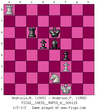 Last move : 1/2-1/2 2011 December 13 19:26:17 [Event "FICGS__CHESS__RAPID_A__000115"] [Site "FICGS"] [Date "2011.09.25"] [Round "1"] [White "Andrucis,Maris"] [Black "Anderson,Peter W."] [Result "1/2-1/2"] [WhiteElo "1905"] [BlackElo "1958"] 1.e4 g6 2.d4 Bg7 3.Nf3 d6 4.Be2 Nf6 5.Nc3 O-O 6.O-O e6 7.Bg5 h6 8.Be3 Nc6 9.h3 b6 10.Qd2 Kh7 11.Bd3 Bb7 12.Rad1 Nb4 13.Bb5 a6 14.Be2 c5 15.a3 Nc6 16.Rfe1 cxd4 17.Nxd4 Ne7 18.f3 Qc7 19.Bf2 Rac8 20.Nb3 d5 21.e5 Qxe5 22.Bxa6 Qb8 23.Bxb7 Qxb7 24.Nd4 Qb8 25.Ncb5 Nh5 26.g4 Nf4 27.Bg3 g5 28.Bxf4 Qxf4 29.Qxf4 gxf4 30.Kg2 Bf6 31.c3 Rfd8 32.Re2 Ng6 33.Na7 Rc5 34.Nb3 Rc4 35.Nb5 R4c8 36.Na7 Ra8 37.Nc6 Rdc8 38.Nb4 Kg7 39.Nd4 Rh8 40.Nd3 h5 41.R2e1 Rh7 42.Rg1 Rc8 43.Rc1 Bh4 44.a4 Kf6 45.Ne2 e5 46.Rgd1 Ke6 47.Ra1 hxg4 48.hxg4 f5 49.gxf5+ Kxf5 50.a5 Rg8 51.Rh1 Ne7 52.Kf1 Kf6 53.Nb4 Ke6 54.axb6 Nf5 55.Nc2 Rb7 56.Ra6 Rgb8 57.Rg1 Rxb6 58.Rg8 R8b7 59.Rga8 Kf7 60.b4 Rb8 61.R8a7+ Be7 62.Rxb6 Rxb6 63.Ra5 Rd6 64.Nc1 Rc6 65.Ne2 Ke6 66.Ncd4+ Nxd4 67.cxd4 Bxb4 68.Ra8 Bd6 69.dxe5 Bxe5 1/2-1/2 Peter W. Anderson Superbly defended ! There were lots of ways for you to lose this game, but you managed to avoid them. Maybe there was a win for me somewhere? Robatsch (Modern) defense Kingside Castling by player Black (move 5) Kingside Castling by player White (move 6) 10 pieces endgame at move 69 : White KRNPP , Black KRBPP WHITE : King + 1 Rook 1 Knight 2 Pawns BLACK : King + 1 Rook 1 Bishop 2 Pawns 9 pieces endgame at move 69 : White KRNP , Black KRBPP WHITE : King + 1 Rook 1 Knight 1 Pawn BLACK : King + 1 Rook 1 Bishop 2 Pawns This chess game ended in a draw. Follow this game move after move (download)Capture of the adverse King is the ultimate but not the first object of the game. (William Steinitz) Die Auseinandersetzung mit Karpow war politisch geprägt. Er stand für das kommunistische System, wurde von dessen Repräsentanten gehätschelt. Ich war der Oppositionelle. Jeder Schachweltmeister spiegelt auch die gesellschaftlichen Verhältnisse wider. Kramnik steht für die Börsen-Generation des Neuen Markts, ideologiefrei, zahlenfixiert. (Garry Kasparov) La vida es como un juego de Ajedrez, cambiando con cada movimiento. (Proverbio Chino) RxDa4 pat (...) Drag your thoughts away from your troubles... by the ears, by the heels, or any other way you can manage it. (Mark Twain)