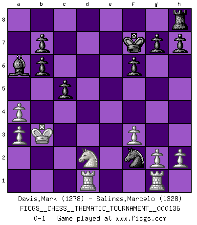 Last move : 0-1 2012 May 15 1:15:4 [Event "FICGS__CHESS__THEMATIC_TOURNAMENT__000136"] [Site "FICGS"] [Date "2011.09.25"] [Round "1"] [White "Davis,Mark"] [Black "Salinas,Marcelo"] [Result "0-1"] [WhiteElo "1278"] [BlackElo "1328"] 1.e4 e5 2.d4 exd4 3.Qxd4 Nc6 4.Qd1 Bc5 5.Nc3 Qf6 6.Nf3 d6 7.Bg5 Qg6 8.Nd5 Qxe4+ 9.Qe2 Qxe2+ 10.Bxe2 Bb6 11.O-O-O Be6 12.Nxb6 axb6 13.a3 Ra4 14.Nd2 Bg4 15.f3 Nd4 16.Bd3 f6 17.Be3 Bf5 18.b3 Bxd3 19.bxa4 Ne2 20.Kb2 Ba6 21.c4 c5 22.Rhe1 Nd4 23.Bxd4 Ne7 24.Bf2 Kf7 25.Kc3 d5 26.cxd5 Nxd5 27.Kb2 Nf4 28.Rg1 Nd3+ 29.Kb3 Nxf2 0-1 This chess game has been lost on time (started : 2011.09.25 16:27:38) Centre game Queenside Castling by player White (move 11) Player Black won this chess game. Follow this game move after move (download)During a Chess competition a Chessmaster should be a combination of a beast of prey and a monk. (Alexander Alekhine) Smyslow ist ein Beweis dafür, dass ich noch zehn Jahre spielen kann! [der 75 jährige über den 85 jährigen] (Viktor Kortschnoi) Fischer deseaba darle a los Rusos una sopa de su propia medicina. (Larry Evans) Le génie consiste à savoir transgresser les règles au moment opportun. (Teichmann) Gambling is the son of avarice and the father of despair. (French proverb)