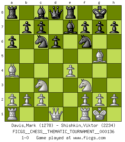 Last move : 1-0 2011 November 15 12:46:24 [Event "FICGS__CHESS__THEMATIC_TOURNAMENT__000136"] [Site "FICGS"] [Date "2011.09.25"] [Round "1"] [White "Davis,Mark"] [Black "Shishkin,Viktor"] [Result "1-0"] [WhiteElo "1278"] [BlackElo "2234"] 1.e4 e5 2.d4 exd4 3.Qxd4 Nc6 4.Qd1 d6 5.Bb5 Nf6 6.Nc3 Be7 7.Bg5 O-O 8.Nf3 Re8 9.O-O a6 10.Ba4 1-0 This chess game has been lost on time (started : 2011.09.25 16:27:38) Centre game Kingside Castling by player Black (move 7) Kingside Castling by player White (move 9) Player White won this chess game. Follow this game move after move (download)At this time Fischer is simply a level above all the best Chessplayers in the world. (John Jacobs) Jeder Schachmeister war einmal ein Anfänger. (Irving Chernev) Entre mas años cumplo, mas valoro los Peones. (Keres) Psychologiquement, tu dois avoir confiance en toi même, mais cette confiance doit être basée sur des faits. (Robert Fischer) A bird doesn't sing because it has an answer, it sings because it has a song. (Maya Angelou)