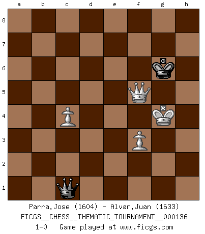 Last move : 1-0 2012 May 19 1:17:33 [Event "FICGS__CHESS__THEMATIC_TOURNAMENT__000136"] [Site "FICGS"] [Date "2011.09.25"] [Round "1"] [White "Parra,Jose"] [Black "Alvar,Juan"] [Result "1-0"] [WhiteElo "1604"] [BlackElo "1633"] 1.e4 e5 2.d4 exd4 3.Qxd4 Nc6 4.Qa4 Nf6 5.c3 Bc5 6.Bg5 Bxf2+ 7.Kxf2 Ng4+ 8.Kg3 Qxg5 9.Nf3 Qg6 10.Nbd2 h5 11.h3 Qd6+ 12.e5 Ncxe5 13.Re1 O-O 14.Ne4 Qg6 15.hxg4 Nxg4 16.Nh4 Qb6 17.Bc4 c6 18.Nd6 Qf2+ 19.Kh3 b5 20.Qb3 bxc4 21.Qxc4 Qf6 22.Ne8 Nf2+ 23.Kh2 Qg5 24.Qd4 Nxh1 25.Nf5 c5 26.Qe5 f6 27.Qd5+ Kh8 28.Qxa8 Qxf5 29.Kxh1 Qg4 30.Kg1 Qg3 31.Re7 Ba6 32.Qxa7 Bc4 33.Qxc5 Bf7 34.Re3 d6 35.Nxd6 Qg4 36.Nxf7+ Rxf7 37.Re8+ Kh7 38.Qd5 Ra7 39.Qd3+ f5 40.Qd5 f4 41.Qd8 Rd7 42.Rh8+ Kg6 43.Qe8+ Kg5 44.Rxh5+ Qxh5 45.Qxd7 Qg6 46.Qd1 Qb6+ 47.Qd4 Qxb2 48.Qxg7+ Kf5 49.Qf7+ Kg5 50.Qb3 Qc1+ 51.Kh2 Qe1 52.Qg8+ Kf5 53.Qf7+ Kg5 54.Qg7+ Kf5 55.Qh7+ Kg5 56.Qd3 Qh4+ 57.Qh3 Qf2 58.a3 Qc5 59.Qf3 Qxa3 60.Kh3 Qc1 61.Qd5+ Kg6 62.c4 f3 63.gxf3 Qh1+ 64.Kg4 Qc1 65.Qf5+ 1-0 Centre game Kingside Castling by player Black (move 13) 10 pieces endgame at move 45 : White KQPPPP , Black KQPP WHITE : King + 1 Queen 4 Pawns BLACK : King + 1 Queen 2 Pawns 9 pieces endgame at move 47 : White KQPPP , Black KQPP WHITE : King + 1 Queen 3 Pawns BLACK : King + 1 Queen 2 Pawns 8 pieces endgame at move 48 : White KQPPP , Black KQP WHITE : King + 1 Queen 3 Pawns BLACK : King + 1 Queen 1 Pawn 7 pieces endgame at move 59 : White KQPP , Black KQP WHITE : King + 1 Queen 2 Pawns BLACK : King + 1 Queen 1 Pawn 6 pieces endgame at move 63 : White KQPP , Black KQ WHITE : King + 1 Queen 2 Pawns BLACK : King + 1 Queen Player White won this chess game. Follow this game move after move (download)Chess is in its essence a game, in its form an art, and in its execution a science. (Baron Tassilo) Ein Schachspiel besteht aus drei Phasen: Die erste, wenn du hofftst den Vorteil zu haben, die zweite, wenn du glaubst einen Vorteil zu haben, und die dritte.... wenn du weißt Du wirst verlieren. (Savielly Grigorievitsch Tartakower) Solo puedes ser bueno en el Ajedrez si amas al juego. (Bobby Fischer) La vérité est comme le meilleur coup aux échecs : elle existe, mais il faut la chercher. (Arturo Perez-Reverte) Life is pain my dear and anyone who says otherwise is selling something. (Princess Bride)