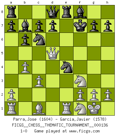 Last move : 1-0 2011 October 9 16:31:13 [Event "FICGS__CHESS__THEMATIC_TOURNAMENT__000136"] [Site "FICGS"] [Date "2011.09.25"] [Round "1"] [White "Parra,Jose"] [Black "Garcia,Javier"] [Result "1-0"] [WhiteElo "1604"] [BlackElo "1578"] 1.e4 e5 2.d4 exd4 3.Qxd4 Nc6 4.Qd1 b6 5.Bc4 Nf6 6.Nd2 Bb4 7.c3 Bc5 8.Ngf3 O-O 9.O-O Bb7 10.Re1 Re8 11.b4 Bf8 12.Nf1 Nxe4 13.Bxf7+ Kxf7 14.Qd5+ 1-0 Centre game Kingside Castling by player Black (move 8) Kingside Castling by player White (move 9) Player White won this chess game. Follow this game move after move (download)Chess is a terrible game. If you have no center, your opponent has a freer position. If you do have a center, then you really have something to worry about ! (Siegbert Tarrasch) Ein Remis kann durch Wiederholung von drei Zügen oder durch einen schlechte Zug erreicht werden. (Savielly Grigorievitsch Tartakower) Aquel que toma al Peón de Caballo de la Reina, se pasará la noche a dormir en la calle. (Anónimo) Il vaut mieux sacrifier les pièces de l'adversaire. (Xavier Tartacover) Children in the dark cause accidents, accidents in the dark cause children. (Unknown)