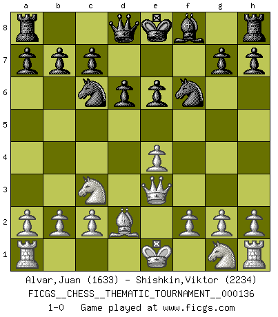 Last move : 1-0 2011 November 29 14:31:24 [Event "FICGS__CHESS__THEMATIC_TOURNAMENT__000136"] [Site "FICGS"] [Date "2011.09.25"] [Round "1"] [White "Alvar,Juan"] [Black "Shishkin,Viktor"] [Result "1-0"] [WhiteElo "1633"] [BlackElo "2234"] 1.e4 e5 2.d4 exd4 3.Qxd4 Nc6 4.Qe3 Nf6 5.Nc3 d6 6.Bc4 Be6 7.Bxe6 fxe6 8.Bd2 1-0 This chess game has been lost on time (started : 2011.09.25 16:27:38) Centre game : Berger variation Player White won this chess game. Follow this game move after move (download)Chess is a part of culture and if a culture is declining then Chess too will decline. (Mikhail Botvinnik) Es gibt Leute, die glauben, alles wäre vernünftig, was man mit einem ernsthaften Gesicht tut. (Georg Christoph Lichtenberg) Si un gobernante no entiende al Ajedrez, ¿como puede governar él un reinado?. (El Rey Khusros II) Les échecs sont utiles à l'exercice de la faculté de penser et à celle de l'imagination. Car nous devons posséder une méthode élaborée pour atteindre des buts partout où nous devons conduire notre raison. (Leibnitz) Any activity becomes creative when the doer cares about doing it right or doing it better. (John Updike)