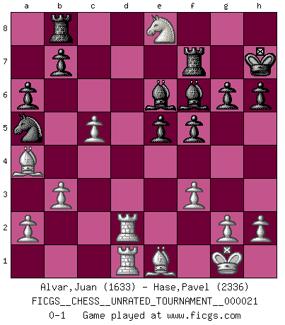 Last move : 0-1 2012 February 6 19:7:23 [Event "FICGS__CHESS__UNRATED_TOURNAMENT__000021"] [Site "FICGS"] [Date "2011.09.25"] [Round "1"] [White "Alvar,Juan"] [Black "Hase,Pavel"] [Result "0-1"] [WhiteElo "1633"] [BlackElo "2336"] 1.e4 Nf6 2.e5 Nd5 3.d4 d6 4.exd6 cxd6 5.c4 Nb6 6.Nc3 g6 7.Be3 Bg7 8.b3 O-O 9.Rc1 e5 10.dxe5 dxe5 11.Qxd8 Rxd8 12.Nf3 Nc6 13.c5 Nd5 14.Nxd5 Rxd5 15.Bc4 Rd8 16.Ng5 Rd7 17.O-O h6 18.Ne4 Na5 19.Bb5 Re7 20.Rfd1 Be6 21.Nd6 a6 22.Ba4 Bc8 23.Rd2 f5 24.f3 Kh7 25.Re1 Be6 26.Bf2 Rb8 27.Red1 Bf6 28.Be1 Rc7 29.Ne8 Rf7 0-1 This chess game has been lost on time (started : 2011.09.25 16:28:16) Alekhine's defense Kingside Castling by player Black (move 8) Kingside Castling by player White (move 17) Player Black won this chess game. Follow this game move after move (download)The chessboard is the world, the pieces are the phenomena of the Universe, the rules of the game are what we call the laws of Nature and the player on the other side is hidden from us. (Thomas Huxley) Sehr viele beherrschen heutzutage das große Einmalseins des Schachspiels und kennen sogar dessen Logarithmentafeln auswendig - deshalb sollte man hin und wieder zu beweisen trachten, dass zwei mal zwei auch fünf sein kann. (Mikhail Nekhemyevich Tal) El Ajedrez es un regaderazo frÃo para la mente. (Sir John Simon) Il vaut mieux sacrifier les pièces de l'adversaire. (Xavier Tartacover) Empty your mind, be formless, shapeless — like water. (Bruce Lee)