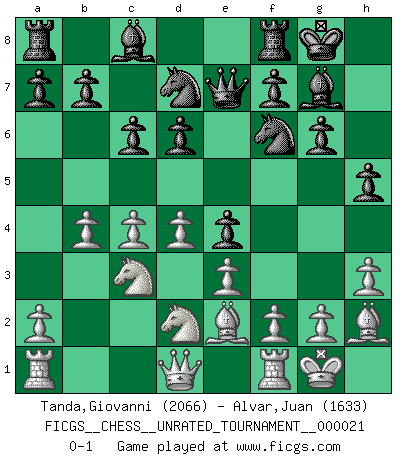 Last move : 0-1 2012 January 23 18:33:36 [Event "FICGS__CHESS__UNRATED_TOURNAMENT__000021"] [Site "FICGS"] [Date "2011.09.25"] [Round "1"] [White "Tanda,Giovanni"] [Black "Alvar,Juan"] [Result "0-1"] [WhiteElo "2066"] [BlackElo "1633"] 1.d4 Nf6 2.Nf3 g6 3.Bf4 Bg7 4.e3 d6 5.h3 O-O 6.Be2 Nbd7 7.O-O Qe8 8.c4 e5 9.Bh2 Qe7 10.Nc3 c6 11.b4 e4 12.Nd2 h5 0-1 This chess game has been lost on time (started : 2011.09.25 16:28:16) King's Indian : London system Kingside Castling by player Black (move 5) Kingside Castling by player White (move 7) Player Black won this chess game. Follow this game move after move (download)You know, comrade Pachman, I don't enjoy being a Minister, I would rather play Chess like you. (Che Guevara) Nach Morphy wurde nichts neues mehr in der Behandlung offener Positionen gefunden. (Mikhail Moiseyevich Botvinik) Me siento como si fuera una pieza en una partida de Ajedrez, cuando mi oponente me indica: esa pieza no puede ser movida. (Soren Kierkegaard) La solitude du joueur d'Echecs à l'approche du mat est semblable à celle du condamné. (Francis Szpiner) Happy endings are just stories that haven't finished yet. (Jane Smith in Mr & Mrs Smith)