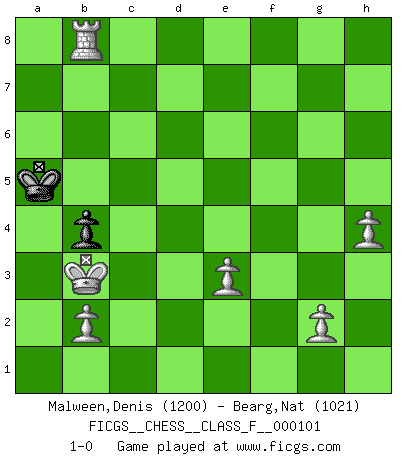 Last move : 1-0 2012 February 16 13:16:30 [Event "FICGS__CHESS__CLASS_F__000101"] [Site "FICGS"] [Date "2011.09.25"] [Round "1"] [White "Malween,Denis"] [Black "Bearg,Nat"] [Result "1-0"] [WhiteElo "1200"] [BlackElo "1021"] 1.e4 e6 2.d4 d5 3.Nc3 dxe4 4.Nxe4 f5 5.Ng3 Nc6 6.Nf3 f4 7.Bxf4 Bd6 8.Qd2 e5 9.dxe5 Bc5 10.c3 Nge7 11.Qxd8+ Nxd8 12.a4 O-O 13.Bc4+ Be6 14.Bxe6+ Nf7 15.Ng5 Rad8 16.N3e4 b6 17.Nxf7 Rxf7 18.Ng5 Rdf8 19.Nxf7 Rxf7 20.Ke2 h6 21.Rad1 g5 22.Be3 Bxe3 23.fxe3 Kg7 24.Bxf7 Kxf7 25.Rd7 a6 26.Rf1+ Ke6 27.Rxe7+ Kxe7 28.e6 Kxe6 29.Rf8 Kd6 30.Rf6+ Kd5 31.Rxh6 a5 32.Rg6 c6 33.Rxg5+ Kc4 34.Kd2 Kb3 35.Rg6 Kxa4 36.h4 b5 37.Rxc6 b4 38.cxb4 axb4 39.Kc2 Kb5 40.Rc8 Ka4 41.Rb8 Ka5 42.Kb3 1-0 French : Rubinstein variation Kingside Castling by player Black (move 12) 10 pieces endgame at move 37 : White KRPPPPP , Black KPP WHITE : King + 1 Rook 5 Pawns BLACK : King + 2 Pawns 9 pieces endgame at move 38 : White KRPPPPP , Black KP WHITE : King + 1 Rook 5 Pawns BLACK : King + 1 Pawn 8 pieces endgame at move 38 : White KRPPPP , Black KP WHITE : King + 1 Rook 4 Pawns BLACK : King + 1 Pawn Player White won this chess game. Follow this game move after move (download)I have always a slight feeling of pity for the man who has no knowledge of Chess. (Siegbert Tarrasch) Obwohl ich vom Stil her kaum zu den Priestern der Schachkunst gezählt werde, halte ich Schach doch für eine Kunst. (Tigran Petrosjan) Una buena ofensiva y una buena defensa, comienzan ambas con un buen desarrollo. (Bruce A. Moon) Le système Elo représente seulement une moyenne. Il est simplement un indicateur de votre stabilité. (Anatoli Karpov) The right perception of any matter and a misunderstanding of the same matter do not wholly exclude each other. (Kafka's the trial)