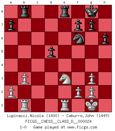 Last move : 1-0 2007 April 26 18:50:50 [Event "FICGS__CHESS__CLASS_D__000024"] [Site "FICGS"] [Date "2007.01.03"] [Round "1"] [White "Lupinacci,Nicola"] [Black "Caburro,John"] [Result "1-0"] [WhiteElo "1400"] [BlackElo "1449"] 1.e4 e5 2.Nf3 Nc6 3.d4 exd4 4.Nxd4 Nf6 5.Nxc6 bxc6 6.Bd3 Bc5 7.Bg5 h6 8.Bh4 d6 9.O-O Rb8 10.b3 O-O 11.Re1 Bg4 12.Be2 Bxe2 13.Qxe2 Re8 14.Nd2 Bd4 15.Rab1 d5 16.Qd3 Be5 17.Bg3 Bxg3 18.hxg3 Qd6 19.exd5 cxd5 20.c4 dxc4 21.Qxd6 cxd6 22.Nxc4 d5 23.Ne3 1-0 Scotch : Schmidt variation Kingside Castling by player White (move 9) Kingside Castling by player Black (move 10) Player White won this chess game. Follow this game move after move (download)Methodical thinking is of more use in Chess than inspiration. (C. J. S. Purdy) Nur ein wirklich starker Spieler weiß wie schwach er spielt. (Savielly Grigorievitsch Tartakower) El jugador táctico debe saber que hacer cuando algo se debe de hacer. El estratégico debe saber que hacer cuando nada se debe de hacer. (Savielly Tartakover) Les Echecs sont affaire de jugement sensible. Savoir quand frapper et quand esquiver. (Fischer) If only people were all showed a certain minimum level of niceness; if only people didn't retract verbal draw offers (without draw box ticked) on ficgs; if only people didn't kill; if only people didn't run concentration / extermination camps, if only people didn't drop nuclear bombs on Hiroshima and Nagasaki, and so on - it would be a much more beautiful world. But sadly, things are not so... (Normajean Yates)