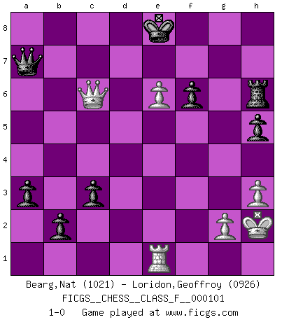 Last move : 1-0 2011 December 24 17:12:52 [Event "FICGS__CHESS__CLASS_F__000101"] [Site "FICGS"] [Date "2011.09.25"] [Round "1"] [White "Bearg,Nat"] [Black "Loridon,Geoffroy"] [Result "1-0"] [WhiteElo "1021"] [BlackElo "0926"] 1.d4 d5 2.c4 dxc4 3.e4 b5 4.Nf3 Nc6 5.Nc3 a6 6.Be2 h5 7.O-O Bg4 8.d5 b4 9.Na4 Na5 10.Nc5 e6 11.dxe6 Bxc5 12.a3 Nb3 13.Bg5 f6 14.Be3 bxa3 15.Rb1 Bxf3 16.Bxf3 Bxe3 17.fxe3 Nd2 18.e5 Nxb1 19.Qxb1 Rh6 20.Bxa8 Qxa8 21.exf6 Nxf6 22.Qf5 axb2 23.e4 c3 24.e5 a5 25.exf6 gxf6 26.h3 a4 27.Re1 Qa7+ 28.Kh2 a3 29.Qb5+ c6 30.Qxc6+ 1-0 QGA : 3.e4 Kingside Castling by player White (move 7) Player White won this chess game. Follow this game move after move (download)A man without frontiers. He didn't divide the East and the West, he brought them together in their admiration for him. (Ljubomir Ljubojevic, about Bobby Fischer's death) Karpov ist ein Museumsstück. (Garry Kasparov) EL Ajedrez es como la vida. (Boris Spassky) Les échecs, c'est la lutte contre l'erreur. (Johannes Zukertort) It is not enough to be a good player... you must also play well. (Siegbert Tarrasch)