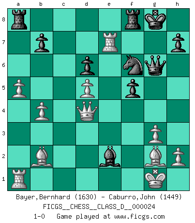 Last move : 1-0 2007 January 25 0:21:14 [Event "FICGS__CHESS__CLASS_D__000024"] [Site "FICGS"] [Date "2007.01.03"] [Round "1"] [White "Bayer,Bernhard"] [Black "Caburro,John"] [Result "1-0"] [WhiteElo "1630"] [BlackElo "1449"] 1.d4 f5 2.g3 Nf6 3.Bg2 g6 4.Nf3 Bg7 5.O-O O-O 6.c4 d6 7.Nc3 Qe8 8.d5 Na6 9.Nd4 Nc5 10.Ncb5 Qd8 11.b4 Nce4 12.f3 a6 13.fxe4 axb5 14.exf5 gxf5 15.cxb5 Ne4 16.Bb2 Qe8 17.a4 Qg6 18.a5 Bd7 19.Qd3 Bxd4+ 20.Qxd4 Nf6 21.Rfc1 Bxb5 22.Rxc7 Bxe2 23.Rxe7 1-0 Dutch defense Kingside Castling by player White (move 5) Kingside Castling by player Black (move 5) Player White won this chess game. Follow this game move after move (download)Chess is thirty to forty percent psychology. You don't have this when you play a computer. I can't confuse it. (Judith Polgar) Du kannst im Schach nur gut werden, wenn du das Spiel liebst. (Robert James Fischer) Hasta este punto, las blancas han seguido un análisis bien conocido. Pero ahora el hace un error fatal: empieza a usar su propia cabeza. (Siegbert Tarrasch) Il n'y a pas de prix trop élevé au scalp de l'ennemi. (Koblentz) I teach you to lie, cheat and steal, and as soon as my back's turned you wait in line ? (Gregory House, House M.D.)