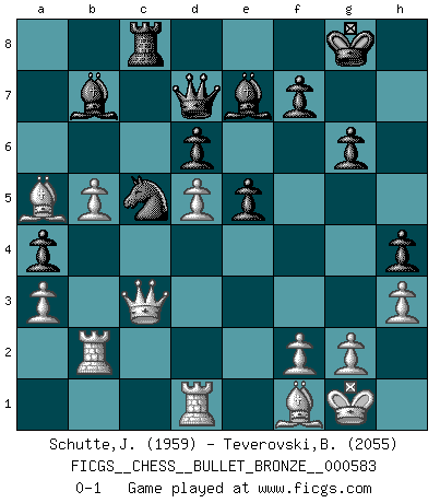 Last move : 0-1 2011 September 26 23:7:55 [Event "FICGS__CHESS__BULLET_BRONZE__000583"] [Site "FICGS"] [Date "2011.09.26"] [Round "1"] [White "Schutte,John"] [Black "Teverovski,Bogoljub"] [Result "0-1"] [WhiteElo "1959"] [BlackElo "2055"] 1.e4 c5 2.Nf3 Nc6 3.d4 cxd4 4.Nxd4 e5 5.Nb5 d6 6.N1c3 a6 7.Na3 b5 8.Nd5 Nce7 9.c4 Nxd5 10.exd5 bxc4 11.Nxc4 Nf6 12.Bd2 a5 13.Bd3 Be7 14.O-O O-O 15.Qf3 Bb7 16.Ne3 g6 17.Rac1 Qb6 18.Bc4 Rfc8 19.b3 Rc7 20.Rfd1 a4 21.b4 h5 22.b5 Rac8 23.Rc2 Rc5 24.Rb1 Nd7 25.Rbc1 Kg7 26.Qd1 Nf6 27.a3 R5c7 28.Qe1 Ra8 29.Bb4 Qa7 30.h3 Qb6 31.Rb1 Kg8 32.Rcb2 R7c8 33.Rd1 Qd8 34.Bf1 Kg7 35.Qe2 Kg8 36.Qf3 Nd7 37.Nc4 Nc5 38.Qc3 h4 39.Na5 Rxa5 40.Bxa5 Qd7 0-1 This chess game has been lost on time (started : 2011.09.26 22:38:7) Sicilian : Labourdonnais-Loewenthal (Kalashnikov) variation Kingside Castling by player White (move 14) Kingside Castling by player Black (move 14) Player Black won this chess game. Follow this game move after move (download)I have never in my life played the French Defence, which is the dullest of all openings. (Wilhelm Steinitz) Vom Schach wurde gesagt das Leben sei dafür nicht lange genug. Aber das ist der Fehler des Lebens, nicht des Schach'. (Irving Chernev) Nunca nadie ha ganado una partida de Ajedrez rindiendose. (Unknown) L'action d'une oeuvre littéraire se déroule sur un champ de bataille. Les masques et les types du drame moderne correspondent aux pièces du jeu d'échecs. L'intrigue correspond aux coups et aux gambits, c'est à dire aux techniques du jeu telles qu'utilisées et interprétées par les joueurs. Les tactiques et les péripéties [mouvements] correspondent aux coups exécutés par l'adversaire. (Viktor Shklovsky) Imagination is more important than knowledge. Knowledge is limited. Imagination encircles the world. (Albert Einstein)