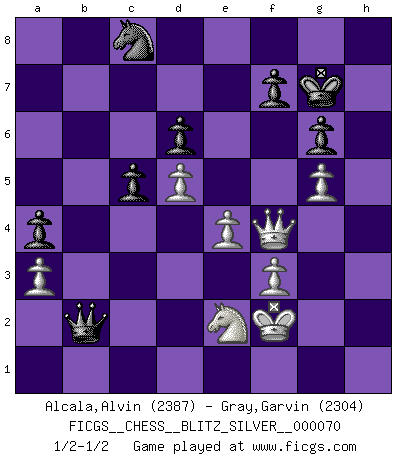 Last move : 1/2-1/2 2011 September 27 21:39:50 [Event "FICGS__CHESS__BLITZ_SILVER__000070"] [Site "FICGS"] [Date "2011.09.27"] [Round "1"] [White "Alcala,Alvin"] [Black "Gray,Garvin"] [Result "1/2-1/2"] [WhiteElo "2387"] [BlackElo "2304"] 1.d4 Nf6 2.c4 e6 3.Nc3 c5 4.d5 exd5 5.cxd5 d6 6.e4 g6 7.f3 Bg7 8.Bg5 O-O 9.Qd2 a6 10.Nge2 b5 11.Ng3 Nbd7 12.Be2 b4 13.Nd1 a5 14.O-O Ba6 15.Bxa6 Rxa6 16.Rc1 Re8 17.Nh1 Qe7 18.Nhf2 R6a8 19.Kh1 a4 20.Re1 Nb6 21.Nd3 Qf8 22.a3 bxa3 23.bxa3 Rab8 24.N1f2 Nfd7 25.Qc2 h6 26.Be3 Qe7 27.Rb1 Kh7 28.Rb5 Qh4 29.R5b1 Qf6 30.Rec1 Qe7 31.Bd2 Bd4 32.Nh3 Ne5 33.Nxe5 Bxe5 34.Nf4 Rec8 35.Nd3 Bd4 36.Nf4 Rb7 37.Ne2 Bg7 38.Rb5 Rcb8 39.Rcb1 Nc8 40.Rxb7 Rxb7 41.Kg1 Rxb1+ 42.Qxb1 Qa7 43.Bc3 Qb6 44.Qa1 Bf8 45.Kf2 Qb3 46.Qc1 Kg8 47.Qf4 Bg7 48.Bxg7 Kxg7 49.h4 Qb2 50.g4 Qb3 51.g5 hxg5 52.hxg5 Qb2 1/2-1/2 Queen's pawn game Kingside Castling by player Black (move 8) Kingside Castling by player White (move 14) This chess game ended in a draw. Follow this game move after move (download)Adequate compensation for a sacrifice is having a sound combination leading to a winning position; adequate compensation for a blunder is having your opponent snatch defeat from the jaws of victory. (Bruce A. Moon) Wenn Dein Gegner dir ein Remis anbietet, versuch herauszufinden, weshalb er glaubt schlechter zu stehen. (Nigel Short) El Ajedrez es el arte del análisis. (Mikhail Botvinnik) A ce moment-là, je menaçais de comprendre la position ! (Clément L'Heureux) Whatever you do, don't be bored. This is absolutely the most exciting time we could have possibly hoped to be alive. And things are just starting. (From movie Waking life)