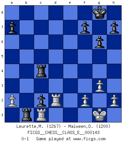 Last move : 0-1 2011 November 3 10:56:26 [Event "FICGS__CHESS__CLASS_E__000143"] [Site "FICGS"] [Date "2011.09.28"] [Round "1"] [White "Leurette,Marc-Antoine"] [Black "Malween,Denis"] [Result "0-1"] [WhiteElo "1267"] [BlackElo "1200"] 1.e4 c5 2.Nc3 e6 3.Nf3 Nc6 4.d4 cxd4 5.Nxd4 Nf6 6.Nxc6 bxc6 7.Bd3 d5 8.exd5 exd5 9.Bg5 Be7 10.Bxf6 Bxf6 11.Qe2+ Be6 12.O-O Bxc3 13.bxc3 O-O 14.c4 d4 15.Qe4 g6 16.Qxc6 Rc8 17.Qb5 Qc7 18.Rac1 Bxc4 19.Bxc4 Qxc4 20.Qxc4 Rxc4 21.Rfd1 Rb8 22.c3 dxc3 23.g3 c2 24.Rd2 Rb1 0-1 Sicilian : Closed Kingside Castling by player White (move 12) Kingside Castling by player Black (move 13) Player Black won this chess game. Follow this game move after move (download)Chess demands total concentration. (Bobby Fischer) Konzentriere dich auf materielle Gewinne. Nimm, was dir dein Gegner gibt, ausser es gibt einen guten Grund der dagegenspricht. (Robert James Fischer) En posiciones complicadas, Bobby Fischer pocas veces tuvo que temer de cualquiera. (Paul Keres) Pour se monter efficace, un Cavalier a besoin d'avant-postes ! Les Cavaliers font les meilleurs bloqueurs de pions passés. Employ the attack like tactic of defense. (Chinese proverb)