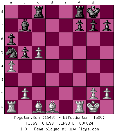 Last move : 1-0 2007 April 1 9:32:1 [Event "FICGS__CHESS__CLASS_D__000024"] [Site "FICGS"] [Date "2007.01.03"] [Round "1"] [White "Keyston,Ron"] [Black "Eife,Gunter"] [Result "1-0"] [WhiteElo "1649"] [BlackElo "1500"] 1.e4 e5 2.Nf3 Nc6 3.Bb5 a6 4.Ba4 Nf6 5.O-O b5 6.Bb3 Bb7 7.c3 Nxe4 8.d4 Na5 9.Bc2 exd4 10.Nxd4 d5 11.f3 c5 12.fxe4 cxd4 13.cxd4 dxe4 14.Nc3 Be7 15.Nxe4 Rc8 16.Nc5 Bxc5 17.dxc5 Qxd1 18.Bxd1 O-O 19.a4 1-0 This chess game has been lost on time (started : 2007.01.03 16:25:50) Ruy Lopez : Archangelsk (counterthrust) variation Kingside Castling by player White (move 5) Kingside Castling by player Black (move 18) Player White won this chess game. Follow this game move after move (download)The winner of the game is the player who makes the next-to-last mistake. (Savielly Tartakover) Verschiedene, sehr schätzbare und im Laufe des Lebens nützliche Eigenschaften des Geistes können durch das Schachspiel erworben und gekräftigt werden, so dass sie zu Gewohnheiten werden, die uns nie im Stich lassen. (Benjamin Franklin) Algunos sacrificios son sólidos, los demás son míos. (Mikhail Tal) On n'a jamais que l'âge auquel on a commence à jouer aux échecs car après on cesse de vieillir. (Capablanca) A good book on your shelf is a friend that turns its back on you and remains a friend. (Author unknown)