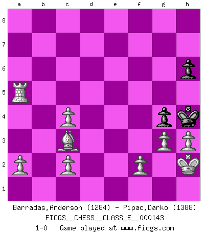 Last move : 1-0 2011 October 11 15:47:35 [Event "FICGS__CHESS__CLASS_E__000143"] [Site "FICGS"] [Date "2011.09.28"] [Round "1"] [White "Barradas,Anderson"] [Black "Pipac,Darko"] [Result "1-0"] [WhiteElo "1284"] [BlackElo "1388"] 1.e4 e5 2.Nf3 Nc6 3.d4 d5 4.Bb5 a6 5.Bxc6+ bxc6 6.exd5 Qxd5 7.Nc3 Bb4 8.O-O Bxc3 9.bxc3 exd4 10.Re1+ Be6 11.Nxd4 Nf6 12.Ba3 c5 13.Nxe6 fxe6 14.Qxd5 Nxd5 15.Rxe6+ Kf7 16.Rc6 Rad8 17.c4 Nc3 18.Rxc7+ Kg6 19.Bb2 Rd1+ 20.Rxd1 Nxd1 21.Rc6+ Kh5 22.Rxc5+ g5 23.Bxh8 h6 24.h3 Nc3 25.Bxc3 a5 26.Rxa5 Kh4 27.Kh2 g4 28.g3+ 1-0 Scotch Opening Kingside Castling by player White (move 8) Player White won this chess game. Follow this game move after move (download)Fischer is completely natural. He plays no roles. He's like a child. Very, very simple. (Zita Rajcsanyi) Heutzutage gewinnt im Turnier nicht derjenige Spieler, der weitreichende Pläne entwirft, sondern einfach jener, der Zug um Zug kämpft. (David Bronstein) Si el ingenio solamente fuese necesario para lucirse, las mujeres serían las mejores jugadoras de Ajedrez del mundo. (Albin) On entre au jeu d'Echecs comme on entre en Religion. Pour le joueur d'Echecs, la partie d'Echecs c'est l'office, la messe, le défilé du 1er Mai, le dépôt de gerbe au Monument aux Morts. C'est un drame sacré. (Michel Roos) Memory... is the diary that we all carry with us. (Oscar Wilde, The Importance of Being Earnest)