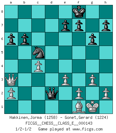 Last move : 1/2-1/2 2011 September 30 20:32:55 [Event "FICGS__CHESS__CLASS_E__000143"] [Site "FICGS"] [Date "2011.09.28"] [Round "1"] [White "Hakkinen,Jorma"] [Black "Gonet,Gerard"] [Result "1/2-1/2"] [WhiteElo "1258"] [BlackElo "1224"] 1.d4 Nf6 2.c4 g6 3.Nf3 Bg7 4.Bg5 c5 5.dxc5 Qa5+ 6.Nc3 Qxc5 7.Bxf6 Bxf6 8.e3 d5 9.Qxd5 Bxc3+ 10.bxc3 Qa3 11.Rd1 Qxc3+ 12.Rd2 O-O 13.Be2 Nc6 14.O-O Be6 15.Qd3 Qa5 16.Qb3 b6 17.Rfd1 Rfd8 18.Rxd8+ Rxd8 19.Rxd8+ Nxd8 20.Nd4 Kf8 21.Nxe6+ Nxe6 22.g3 Qd2 23.Bf1 Nc5 24.Qa3 a6 1/2-1/2 King's Indian, 3.Nf3 Kingside Castling by player Black (move 12) Kingside Castling by player White (move 14) This chess game ended in a draw. Follow this game move after move (download)Chess is as much a mystery as women. (Purdy) Drei Punkte vor allen anderen ist wie einer, der im weißen Anzug posiert, während der Rest in Müllsäcke gekleidet dasteht. (Viktor Kortschnoi) En un gambito tu regalas un Peón por el bién de tomar un juego perdido. (Samuel Standige Boden) Toute estimation doit être constamment réévaluée. (Jacob Estrin) In theory there is no difference between theory and practice. In practice there is. (Yogi Berra)