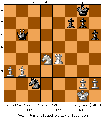 Last move : 0-1 2011 November 2 11:45:13 [Event "FICGS__CHESS__CLASS_E__000143"] [Site "FICGS"] [Date "2011.09.28"] [Round "1"] [White "Leurette,Marc-Antoine"] [Black "Broad,Ken"] [Result "0-1"] [WhiteElo "1267"] [BlackElo "1400"] 1.e4 c5 2.Nc3 Nc6 3.Nf3 d6 4.Bb5 Bd7 5.Bxc6 Bxc6 6.O-O e5 7.d3 Nf6 8.Ne2 Be7 9.Ng3 O-O 10.Nf5 Re8 11.Qe2 Qc7 12.c3 Rad8 13.d4 cxd4 14.cxd4 exd4 15.N5xd4 Bf8 16.Nxc6 Qxc6 17.Bg5 Rxe4 18.Qd3 d5 19.Rac1 Qd6 20.Rfe1 Rxe1+ 21.Rxe1 h6 22.Be3 Ne4 23.Bxa7 b6 24.Qb3 Qc5 25.Bxb6 Qd6 26.Bxd8 Qxd8 27.Qd3 Qb6 28.b3 Nxf2 29.Qxd5 Nd3 30.Qd4 Bc5 31.Re4 Bxd4+ 32.Nxd4 Nb4 33.a3 Nc2 0-1 Sicilian : Closed, 2...Nc6 Kingside Castling by player White (move 6) Kingside Castling by player Black (move 9) Player Black won this chess game. Follow this game move after move (download)Live, lose, and learn, by observing your opponent how to win. (Amber Steenbock) Es hat in meinem Leben Zeiten gegeben, da ich sehr nahe daran war zu glauben, daß ich auch nicht eine einzige Schachpartie verlieren könnte. (José Raúl Capablanca) Yo adoro todas la posiciones. Denme una partida posicional difícil, y la jugaré. Pero posiciones totalmente ganadas, no las tolero. (Hein Donner) Le joueur d'Echecs qui veut atteindre le top est obligé de développer son propre credo créatif. Alexeï Stepanovicth Souétine. Il est facile d'écrire des livres ! Ce qui est difficile, c'est de jouer ! (Alexeï Stepanovicth Souétine) A mistake is only a mistake if you let it happen twice. Otherwise it is a learning experience. (Daniel Parmet)