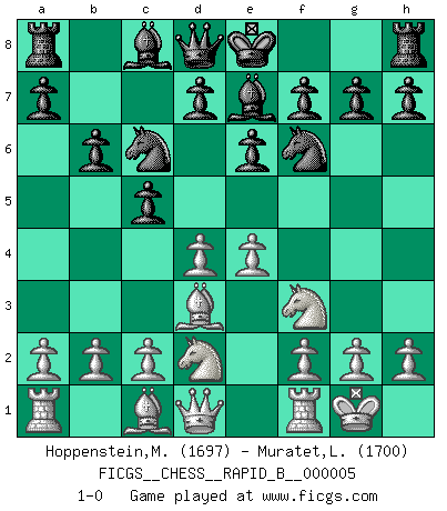 Last move : 1-0 2006 June 20 11:27:20 [Event "FICGS__CHESS__RAPID_B__000005"] [Site "FICGS"] [Date "2006.05.10"] [Round "1"] [White "Hoppenstein,Michael"] [Black "Muratet,Lucas"] [Result "1-0"] [WhiteElo "1697"] [BlackElo "1700"] 1.d4 Nf6 2.Nf3 e6 3.e3 c5 4.Bd3 Nc6 5.O-O b6 6.Nbd2 Be7 7.e4 1-0 This chess game has been lost on time (started : 2006.05.10 11:52:43) Queen's pawn : Yusupov-Rubinstein system Kingside Castling by player White (move 5) Player White won this chess game. Follow this game move after move (download)Life is like a game of Chess, changing with each move. (Chinese proverb) Heutzutage gewinnt im Turnier nicht derjenige Spieler, der weitreichende Pläne entwirft, sondern einfach jener, der Zug um Zug kämpft. (David Bronstein) El Ajedrez es imaginación. (David Bronstein) Echiquier : carré parfait, comme la Jérusalem nouvelle décrite par l'auteur de l'Apocalypse, huit cases sur huit, exaltation du chiffre 4, symbole du cosmos aux quatre horizons... où le noir et le blanc, l'ombre et la lumière, le mal et le bien s'entremêlent et se conjuguent. (Robert Couffignal, Le Gambit du poète) Drag your thoughts away from your troubles... by the ears, by the heels, or any other way you can manage it. (Mark Twain)