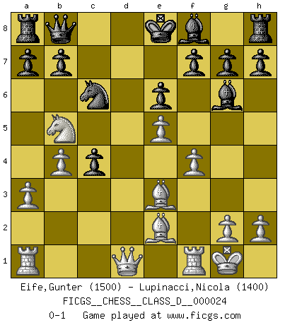 Last move : 0-1 2007 April 10 4:39:33 [Event "FICGS__CHESS__CLASS_D__000024"] [Site "FICGS"] [Date "2007.01.03"] [Round "1"] [White "Eife,Gunter"] [Black "Lupinacci,Nicola"] [Result "0-1"] [WhiteElo "1500"] [BlackElo "1400"] 1.e4 c6 2.d4 d5 3.e5 Bf5 4.Nf3 e6 5.Be2 c5 6.Be3 cxd4 7.Nxd4 Bg6 8.a3 Qc7 9.f4 Nc6 10.Nc3 Nge7 11.Nxc6 Nxc6 12.O-O Na5 13.Nb5 Qb8 14.b4 Nc6 15.c4 dxc4 0-1 Caro-Kann : Advance variation Kingside Castling by player White (move 12) Player Black won this chess game. Follow this game move after move (download)There's never before been a Chess player with such a thorough knowledge of the intricacies of the game and such an absolutely indomitable will to win. I think Bobby is the greatest player that ever lived. (Lisa Lane) Das ganze Leben mit einer Ehefrau ist wie ein Endspiel mit ungleichfarbigen Läufern. (Viktor Kortschnoi) El Jaque al descubierto es el bombardero del tablero. (Reuben Fine) Je ne crois pas en la psychologie, je crois aux bons coups. (Robert Fischer) I don't know, I don't care, and it doesn't make any difference. (Albert Einstein)
