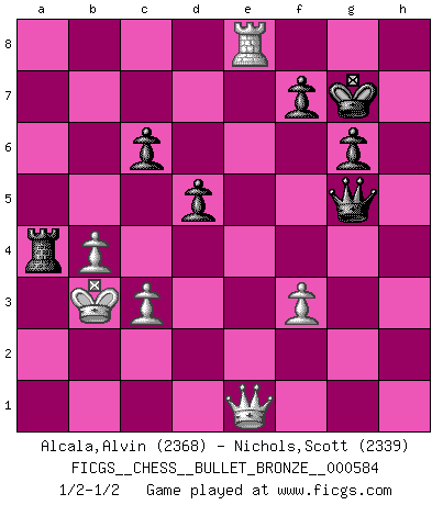Last move : 1/2-1/2 2011 September 28 17:46:49 [Event "FICGS__CHESS__BULLET_BRONZE__000584"] [Site "FICGS"] [Date "2011.09.28"] [Round "1"] [White "Alcala,Alvin"] [Black "Nichols,Scott"] [Result "1/2-1/2"] [WhiteElo "2368"] [BlackElo "2339"] 1.e4 e5 2.Nf3 Nf6 3.Nxe5 d6 4.Nf3 Nxe4 5.Nc3 Nxc3 6.dxc3 Be7 7.Be3 O-O 8.Qd2 Re8 9.O-O-O Be6 10.Kb1 Nd7 11.Nd4 Bd5 12.Nf5 Bc6 13.Rg1 a5 14.Be2 a4 15.a3 Bf8 16.g4 g6 17.Nd4 Bg7 18.g5 Qe7 19.Rge1 Bxd4 20.cxd4 Nb6 21.h4 Qe6 22.h5 Be4 23.hxg6 hxg6 24.Bd3 Nd5 25.Bb5 c6 26.Bd3 Bxd3 27.Qxd3 Qe4 28.Qf1 Qf3 29.Qg1 Qh3 30.Bc1 Kg7 31.f3 b5 32.Qf2 Rh8 33.Re4 b4 34.axb4 a3 35.Rde1 Qf5 36.bxa3 Nc3+ 37.Kb2 Nxe4 38.Rxe4 Qb5 39.Qe1 Rxa3 40.Kxa3 Ra8+ 41.Kb3 d5 42.Re2 Qc4+ 43.Kb2 Ra4 44.Bf4 Qxd4+ 45.c3 Qxf4 46.Re8 Qxg5 47.Kb3 1/2-1/2 Petrov : Nimzovich attack Kingside Castling by player Black (move 7) Queenside Castling by player White (move 9) This chess game ended in a draw. Follow this game move after move (download)Help your pieces so they can help you. (Paul Morphy) Schach ist das Spiel, das die Verrückten gesund hält. (Albert Einstein) Los finales de Peón son del Ajedrez lo que el cesped es del Golf. (Cecil Purdy) Les écrivains ont utilisé les échecs pour analyser les côtés extrêmes de la nature humaine. Dans ce cadre, les échecs offrent un champ d'expérimentation idéal. Mais on pourrait faire la même chose avec la peinture. Et là, en vous référant à Van Gogh, vous ne tirerez pas de conclusion définitive sur les peintres. (Gary Kasparov) Chess, like love, like music, has the power to make people happy. (Siegbert Tarrasch)