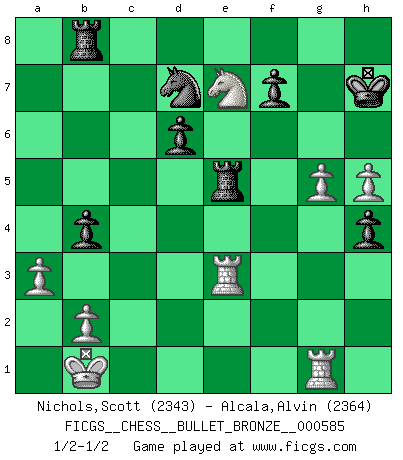 Last move : 1/2-1/2 2011 September 28 18:12:1 [Event "FICGS__CHESS__BULLET_BRONZE__000585"] [Site "FICGS"] [Date "2011.09.28"] [Round "1"] [White "Nichols,Scott"] [Black "Alcala,Alvin"] [Result "1/2-1/2"] [WhiteElo "2343"] [BlackElo "2364"] 1.e4 c5 2.Nf3 d6 3.d4 cxd4 4.Nxd4 Nf6 5.Nc3 a6 6.Be3 e5 7.Nb3 Be6 8.f3 h5 9.Nd5 Nxd5 10.exd5 Bf5 11.Bd3 Bxd3 12.Qxd3 Nd7 13.O-O-O Be7 14.Kb1 Bg5 15.f4 Bxf4 16.Bxf4 exf4 17.Qf5 Ne5 18.Qxf4 Rc8 19.h3 O-O 20.g4 h4 21.Rhf1 Re8 22.Nd4 Qc7 23.a3 Nc4 24.Rd3 Ne5 25.Rc3 Qb6 26.Re3 Qc5 27.Rfe1 Qxd5 28.c3 Rc7 29.Qg5 g6 30.Rg1 a5 31.Qxh4 b5 32.Qf6 Rec8 33.h4 b4 34.h5 Nd7 35.Qh4 g5 36.Nf5 gxh4 37.Ne7+ Kh7 38.Nxd5 Rc5 39.Ne7 Rb8 40.cxb4 axb4 41.g5 Re5 1/2-1/2 Sicilian : Najdorf, Byrne (English) attack Queenside Castling by player White (move 13) Kingside Castling by player Black (move 19) This chess game ended in a draw. Follow this game move after move (download)Play the opening like a book, the middle game like a magician, and the endgame like a machine. (Spielmann) Die Partien sind immer verschieden, die Interviews immer die gleichen. (Garry Kasparov) El ganador de una partida es aquel jugador que hace el penúltimo error. (Savielly Tartakover) Nous vivons dans un monde échiquéen : chaque jour qui passe est un défi à relever. (Philosophe Sasha) Wisdom is the reward you get for a lifetime of listening when you'd have preferred to talk. (Doug Larson)