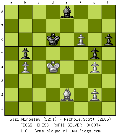 Last move : 1-0 2011 October 9 18:47:16 [Event "FICGS__CHESS__RAPID_SILVER__000074"] [Site "FICGS"] [Date "2011.09.28"] [Round "2"] [White "Gazi,Miroslav"] [Black "Nichols,Scott"] [Result "1-0"] [WhiteElo "2291"] [BlackElo "2266"] 1.Nf3 Nf6 2.c4 c6 3.Nc3 d5 4.e3 e6 5.d4 Nbd7 6.Qc2 Bd6 7.Bd3 dxc4 8.Bxc4 b5 9.Be2 Bb7 10.e4 e5 11.dxe5 Nxe5 12.Nd4 g6 13.Bg5 h6 14.Bh4 Ned7 15.Rd1 Qc7 16.Bg3 Bxg3 17.hxg3 a6 18.Nd5 Qd6 19.Nxf6+ Qxf6 20.Nb3 Rd8 21.f4 c5 22.Nxc5 Nxc5 23.Rxd8+ Qxd8 24.Qxc5 Qe7 25.Qc3 f6 26.e5 Kf7 27.exf6 Qxf6 28.Qc7+ Qe7 29.Qxe7+ Kxe7 30.Kf2 Bd5 31.b3 Bf7 32.Rc1 Rd8 33.Rc7+ Rd7 34.Rxd7+ Kxd7 35.Ke3 Kd6 36.Kd4 g5 37.f5 Bd5 38.Bf3 Bf7 39.Kc3 a5 40.a3 Kc5 41.b4+ axb4+ 42.axb4+ Kd6 43.Be2 Be8 44.Kd4 Bc6 45.Bf3 Be8 46.f6 Bf7 47.Be2 Be8 48.g4 1-0 Reti Opening Player White won this chess game. Follow this game move after move (download)The beauty of a move lies not in its' appearance but in the thought behind it. (Siegbert Tarrasch) Auf jeden Fall musst du zuerst Rechtsanwalt werden, damit du deine eigenen Interessen und die deiner Familie vertreten kannst. [Brief an seinen Sohn] (José Raúl Capablanca) Si no le temes a Spassky, entonces elimino el elemento del dinero. (Jim Slater) Seul un grand joueur sait à quel point il joue faiblement. (Xavier Tartacover) Before all elsed, be armed. (Niccolo Machiavelli)