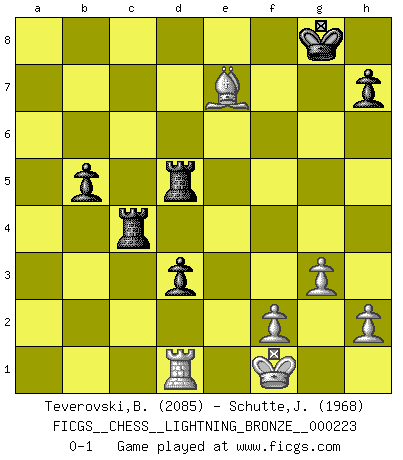 Last move : 0-1 2011 September 28 22:21:43 [Event "FICGS__CHESS__LIGHTNING_BRONZE__000223"] [Site "FICGS"] [Date "2011.09.28"] [Round "1"] [White "Teverovski,Bogoljub"] [Black "Schutte,John"] [Result "0-1"] [WhiteElo "2085"] [BlackElo "1968"] 1.d4 d5 2.c4 e6 3.Nf3 Nf6 4.g3 dxc4 5.Bg2 a6 6.O-O Nc6 7.Nc3 Rb8 8.e4 Be7 9.Qe2 b5 10.Rd1 O-O 11.d5 exd5 12.e5 d4 13.exf6 Bxf6 14.Qe4 Bb7 15.Nd5 Nb4 16.Nxf6+ Qxf6 17.Qf4 c5 18.Qxf6 gxf6 19.Bf4 Rbd8 20.Bc7 Rc8 21.Bd6 Rfd8 22.Be7 Re8 23.Bxf6 Nd3 24.Rab1 Be4 25.a4 Rc6 26.Bh4 f6 27.axb5 axb5 28.b4 Nxb4 29.Nxd4 cxd4 30.Rxb4 d3 31.Bxe4 Rxe4 32.Kf1 Re5 33.R4b1 Rd5 34.Rbc1 c3 35.Bxf6 c2 36.Be7 cxd1Q+ 37.Rxd1 Rc4 0-1 This chess game has been lost on time (started : 2011.09.28 21:15:16) Queen's gambit declined Kingside Castling by player White (move 6) Kingside Castling by player Black (move 10) Promotion Queen by player Black (move 36) Player Black won this chess game. Follow this game move after move (download)The winner of the game is the player who makes the next-to-last mistake. (Savielly Tartakover) Es ist im Leben wie im Schachspiel. Wir entwerfen einen Plan, dieser bleibt jedoch bedingt durch das, was im Schachspiel dem Gegner, im Leben dem Schicksal zu tun belieben wird. (Arthur Schopenhauer) La táctica fluye a partir de una posición superior. (Bobby Fischer) Ne tendez aucun piège pour le plaisir ! Ne jouez rien dans l'espoir que l'adversaire réagisse de façon stupide ! Prenez toujours pour acquis que l'adversaire va trouver le meilleur coup ! Ne jouez jamais de coup dans l'espoir que l'adversaire ne voie pas la menace ! Chacun de vos coups doit améliorer la position d'une façon ou d'une autre. Unless I accept my faults I will most certainly doubt my virtues. (Hugh Prather)