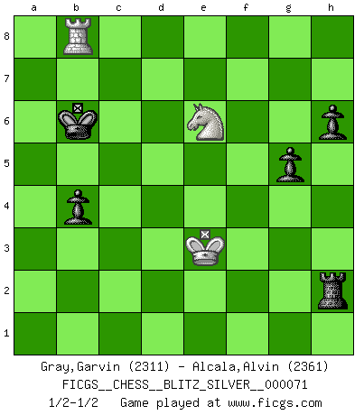 Last move : 1/2-1/2 2011 September 30 10:52:12 [Event "FICGS__CHESS__BLITZ_SILVER__000071"] [Site "FICGS"] [Date "2011.09.30"] [Round "1"] [White "Gray,Garvin"] [Black "Alcala,Alvin"] [Result "1/2-1/2"] [WhiteElo "2311"] [BlackElo "2361"] 1.d4 Nf6 2.c4 c6 3.Nf3 d5 4.Nc3 e6 5.Bg5 h6 6.Bxf6 Qxf6 7.e3 Nd7 8.Bd3 Qd8 9.O-O Be7 10.e4 dxc4 11.Bxc4 b5 12.Bb3 O-O 13.d5 Nc5 14.dxe6 Bxe6 15.Bxe6 Nxe6 16.Qc2 Qb6 17.Ne2 Rad8 18.Rad1 Rfe8 19.g3 Bb4 20.a3 Bd6 21.Ned4 c5 22.Nxe6 fxe6 23.b3 a6 24.a4 Rc8 25.axb5 axb5 26.Rd3 c4 27.bxc4 Rxc4 28.Qe2 Rf8 29.Kg2 Qc5 30.Rfd1 Bc7 31.Rd7 Qc6 32.R1d2 Rf6 33.R7d4 Rc3 34.R4d3 Rc4 35.Nd4 Qc5 36.Kh3 Be5 37.Nb3 Qb4 38.f4 Bxf4 39.gxf4 Rxe4 40.Re3 R6xf4 41.Rd8+ Kf7 42.R8d3 Ke7 43.Nd2 Rxe3+ 44.Rxe3 Rh4+ 45.Kg2 Qg4+ 46.Qxg4 Rxg4+ 47.Kf2 Kd6 48.Rd3+ Kc5 49.Rc3+ Kd5 50.Rc8 b4 51.Rd8+ Kc5 52.Re8 Kd5 53.Nf3 g5 54.Rd8+ Kc5 55.Rc8+ Kb5 56.Ke3 Rg2 57.Nd4+ Kb6 58.Nxe6 Rxh2 59.Rb8+ 1/2-1/2 Queen's pawn game Kingside Castling by player White (move 9) Kingside Castling by player Black (move 12) 10 pieces endgame at move 46 : White KRNP , Black KRPPPP WHITE : King + 1 Rook 1 Knight 1 Pawn BLACK : King + 1 Rook 4 Pawns 9 pieces endgame at move 58 : White KRNP , Black KRPPP WHITE : King + 1 Rook 1 Knight 1 Pawn BLACK : King + 1 Rook 3 Pawns 8 pieces endgame at move 58 : White KRN , Black KRPPP WHITE : King + 1 Rook 1 Knight BLACK : King + 1 Rook 3 Pawns This chess game ended in a draw. Follow this game move after move (download)Chess is the gymnasium of the mind. (Blaise Pascal) Jeder Schachmeister war einmal ein Anfänger. (Irving Chernev) Una buena memoria, concentración, imaginación y una fuerte voluntad, se requiere para llegar a ser un buen jugador. (Bobby Fischer) Un footballeur joue avec ses pieds, parfois avec sa tête. Un joueur d'échecs ne joue qu'avec sa tête. Et quand il ne joue plus, il meurt. (Jacob Murray) Life is the sum of all your choices. (Albert Camus)
