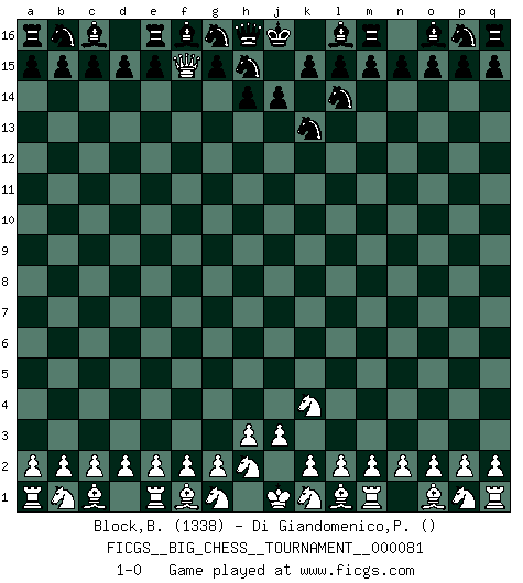 Last move : 1-0 2011 October 1 23:20:48 [Event "FICGS__BIG_CHESS__TOURNAMENT__000081"] [Site "FICGS"] [Date "2011.09.30"] [Round "1"] [White "Block,Benjamin"] [Black "Di Giandomenico,Pierino"] [Result "1-0"] [WhiteElo "1338"] [BlackElo ""] 1.j2-k4 j15-k13 2.h1-o7 k16-l14 3.o7-f15 1-0 Follow this game move after move (download)Some part of a mistake is always correct. (Savielly Tartakover) Schach ist Kampf, hauptsächlich jedoch gegen die eigenen Fehler. (Savielly Grigorievitsch Tartakower) El Ajedrez es como la guerra en un tablero. (Bobby Fischer) Vouloir jouer aux échecs contre soi-même est aussi paradoxal que vouloir marcher sur son ombre. (Stefan Zweig) Be who you are, and say what you feel because those who mind don't matter, and those who matter don't mind. (Dr Seuss)