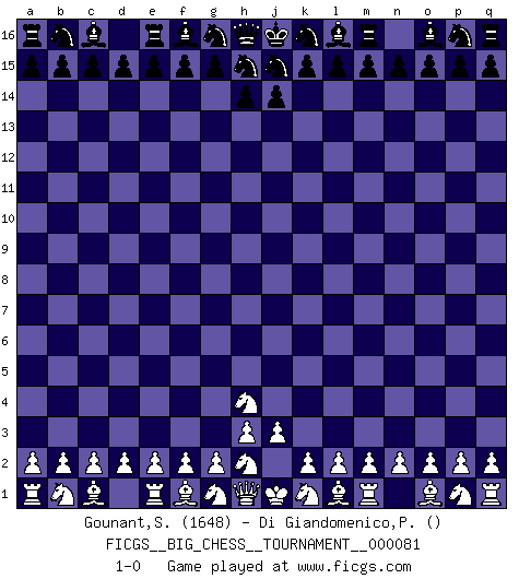 Last move : 1-0 2011 October 1 23:21:9 [Event "FICGS__BIG_CHESS__TOURNAMENT__000081"] [Site "FICGS"] [Date "2011.09.30"] [Round "1"] [White "Gounant,Stanislas"] [Black "Di Giandomenico,Pierino"] [Result "1-0"] [WhiteElo "1648"] [BlackElo ""] 1.j2-h4 1-0 Follow this game move after move (download)Chess is thirty to forty percent psychology. You don't have this when you play a computer. I can't confuse it. (Judith Polgar) Spielt Blackmar-Diemer-Gambit, und das Matt kommt von selbst! (Emil Joseph Diemer) Me gusta decir que Bobby Fischer fue el mejor jugador que jamás haya existido. Pero lo que hizo de Fischer un genio, fue su habilidad de mezclar una frescura y pragmatismo Americano con ideas Rusas acerca de la estrategia. (Bruce Pandolfini) Toute estimation doit être constamment réévaluée. (Jacob Estrin) Panic is a sudden desertion of us, an a going over to the enemy of our imagination. (Christian Nevell Bovee)