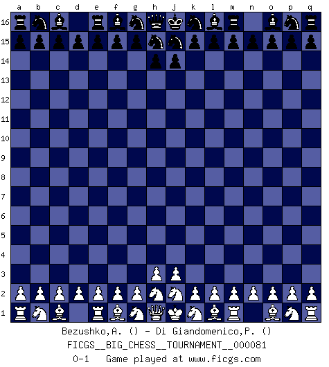 Last move : 0-1 2011 September 30 17:10:34 [Event "FICGS__BIG_CHESS__TOURNAMENT__000081"] [Site "FICGS"] [Date "2011.09.30"] [Round "1"] [White "Bezushko,Anton"] [Black "Di Giandomenico,Pierino"] [Result "0-1"] [WhiteElo ""] [BlackElo ""] 0-1 Follow this game move after move (download)You may learn much more from a game you lose than from a game you win. You will have to lose hundreds of games before becoming a good player. (Jose Raul Capablanca) Wenn du gegen Bobby spielst, ist es keine Frage von gewinnen oder verlieren. Es ist eine Frage des Überlebens. (Boris Vassilievich Spassky) En manos de Fischer's, una diminuta ventaja teórica es tan buena como tener una Reina de ventaja. (Isaac Kashdan) Votre prénom est 'Tactique', votre deuxième prénom est 'Tactique' et votre nom est 'Tactique'. (Ken Smith) Art disturbs, science reassures. (Georges Braque, Le Jour et la Nuit)