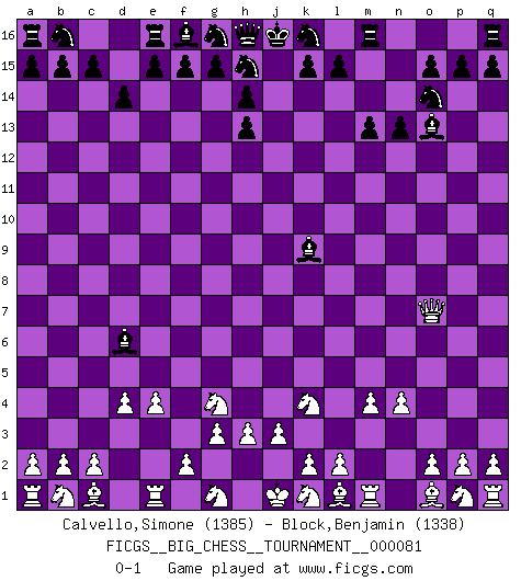 Last move : 0-1 2012 January 3 17:34:11 [Event "FICGS__BIG_CHESS__TOURNAMENT__000081"] [Site "FICGS"] [Date "2011.09.30"] [Round "1"] [White "Calvello,Simone"] [Black "Block,Benjamin"] [Result "0-1"] [WhiteElo "1385"] [BlackElo "1338"] 1.j2-k4 p16-o14 2.h2-g4 j15-h13 3.m2-m4 d15-d14 4.n2-n4 n15-n13 5.e2-e4 o16-d6 6.g2-g3 m15-m13 7.d2-d4 l16-o13 8.f1-a6 c16-j10 9.a6-h13 j14-h13 10.h1-o7 j10-k9 0-1 This big chess game has been lost on time (started : 2011.09.30 17:9:30) Follow this game move after move (download)Only sissies Castle. (Rob Sillars) Du weisst es gibt ein Problem mit Computern und Fernschach, wenn jeder eine Rating von 2450 hat. (John Christen Knudsen) Diferente gente reacciona diferentemente en aceptar la derrota. (Bobby Fischer) Des combinaisons [dans le jeu d'échecs] pareilles à des mélodies. Je crois entendre pour ainsi dire la musique des coups... (Vladimir Nabokov) Gambling : The sure way of getting nothing from something. (Wilson Mizner)