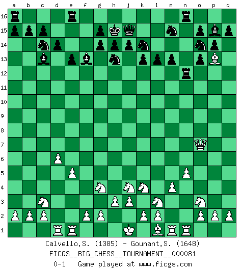 Last move : 0-1 2012 January 2 5:34:21 [Event "FICGS__BIG_CHESS__TOURNAMENT__000081"] [Site "FICGS"] [Date "2011.09.30"] [Round "1"] [White "Calvello,Simone"] [Black "Gounant,Stanislas"] [Result "0-1"] [WhiteElo "1385"] [BlackElo "1648"] 1.j2-k4 j15-h13 2.h2-g4 m15-m13 3.e2-e4 l16-o13 4.d2-d4 n15-n14 5.m2-m4 l15-l13 6.n2-n4 k15-k13 7.g1-f3 p16-o14 8.k1-l3 h15-k14 9.b1-c3 e15-e13 10.f1-d3 f16-c13 11.c1-k8 d15-d14 12.p1-o3 b16-c14 13.a1-d1 g16-j15 14.o1-d11 j15-g14 15.d11-g14 f15-g14 16.e4-e5 c16-f13 17.d3-o13 n14-o13 18.h1-o7 p15-p14 19.k8-p13 o16-p15 20.q1-n1 k16-m15 21.f3-h2 h16-j15 22.d4-d5 q16-n16 23.d5-d6 n16-n12 24.h2-j4 m16-n16 25.n4-n5 j16-h15 0-1 Follow this game move after move (download)Who is your opponent tonight, tonight I am playing against the Black pieces. (Akiba Rubinstein) Ich habe Putins Aufstieg an die Macht beobachtet und seine Politik, die demokratischen Institutionen meines Landes zu zerstören. (Garry Kasparov) De eso se trata el Ajedrez. Un día le das una lección a tu oponente y al día siguiente el te da una a tí. (Bobby Fischer) La vie est comme un jeu d'échecs : nous esquissons un plan, mais celui-ci est tributaire de ce que daignent faire l'adversaire aux échecs et le destin dans la vie. (Arthur Schopenhauer) A bird doesn't sing because it has an answer, it sings because it has a song. (Maya Angelou)