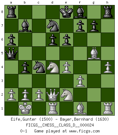 Last move : 0-1 2007 April 1 9:32:1 [Event "FICGS__CHESS__CLASS_D__000024"] [Site "FICGS"] [Date "2007.01.03"] [Round "1"] [White "Eife,Gunter"] [Black "Bayer,Bernhard"] [Result "0-1"] [WhiteElo "1500"] [BlackElo "1630"] 1.e4 c5 2.Nf3 d6 3.d4 cxd4 4.Nxd4 Nf6 5.Nc3 a6 6.Be3 e6 7.f3 b5 8.g4 h6 9.Qd2 Nbd7 10.O-O-O Ne5 11.Bf4 Nfd7 12.h4 Bb7 13.g5 b4 14.Nce2 hxg5 15.Bxg5 Qa5 16.Kb1 Nc4 0-1 This chess game has been lost on time (started : 2007.01.03 16:25:50) Sicilian : Najdorf, Byrne (English) attack Queenside Castling by player White (move 10) Player Black won this chess game. Follow this game move after move (download)Chess is in its essence a game, in its form an art, and in its execution a science. (Baron Tassilo) Schach wird sich dank seiner hohen kulturellen Tradition immer durchsetzen. In näherer Zukunft womöglich sogar als Gegenreaktion auf die maßlose Reizüberflutung im Freizeit- und Spielbereich. (Garry Kasparov) Un jugador que trata de regresar una movida en el Ajedrez es un futuro carterista. (Richard Fenton) La vérité est comme le meilleur coup aux échecs : elle existe, mais il faut la chercher. (Arturo Perez-Reverte) Now the reason the enlightened prince and the wise general conquer the enemy whenever they move and their achievements surpass those of ordinary men is foreknowledge. (Sun Tzu)
