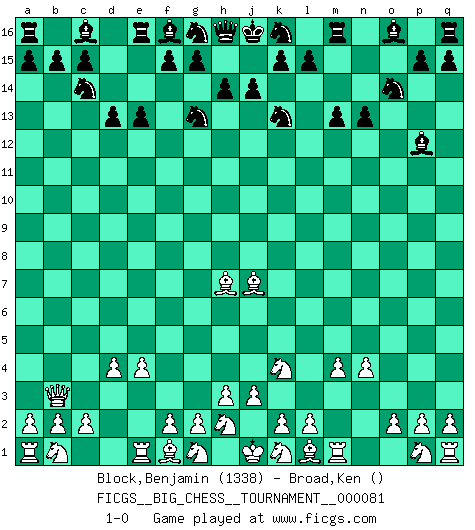 Last move : 1-0 2011 October 23 9:57:27 [Event "FICGS__BIG_CHESS__TOURNAMENT__000081"] [Site "FICGS"] [Date "2011.09.30"] [Round "1"] [White "Block,Benjamin"] [Black "Broad,Ken"] [Result "1-0"] [WhiteElo "1338"] [BlackElo ""] 1.j2-k4 b16-c14 2.h1-o7 h15-g13 3.o7-o15 p16-o14 4.o15-b3 j15-k13 5.d2-d4 n15-n13 6.c1-j7 d15-d13 7.n2-n4 e15-e13 8.o1-h7 m15-m13 9.e2-e4 l16-p12 10.m2-m4 1-0 Follow this game move after move (download)Avoid the crowd. Do your own thinking independently. Be the Chess player, not the Chess piece. (Ralph Charell) Kein Großmeister ist normal. Sie unterscheiden sich nur im Ausmaß Ihrer Verrücktheit. (Viktor Kortschnoi) Tu sabes, camarada Pachman, no disfruto el ser un Ministro, preferería jugar al Ajedrez como tu. (Che Guevara) Demandez au pauvre Cg1 ce qu'il en pense. Eduard Gufeld à propos de la variante Saemisch de l'Est-Indienne. Chess is everything: art, science and sport. (Anatoly Karpov)