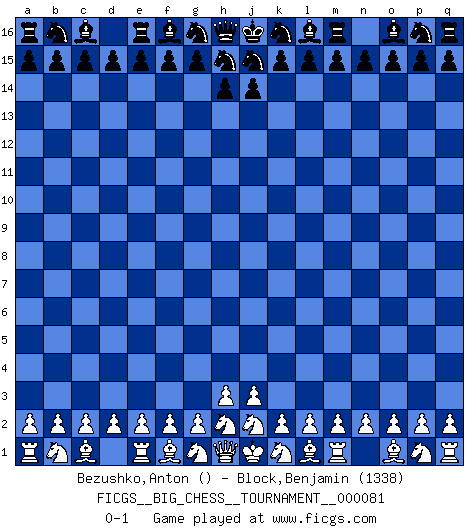Last move : 0-1 2011 September 30 17:10:43 [Event "FICGS__BIG_CHESS__TOURNAMENT__000081"] [Site "FICGS"] [Date "2011.09.30"] [Round "1"] [White "Bezushko,Anton"] [Black "Block,Benjamin"] [Result "0-1"] [WhiteElo ""] [BlackElo "1338"] 0-1 Follow this game move after move (download)Bobby Fischer's current state of mind is indeed a tragedy. One of the world's greatest Chess players - the pride and sorrow of American Chess. (Frank Brady) Im Hotelzimmer gab es nur zwei Schaben. (Über die Turnierbedingungen) (Peter Swidler) Todos los Maestros de Ajedrez fueron un día unos principiantes. (Chernev) RxDa4 pat (...) There are two types of people in this world, good and bad. The good sleep better, but the bad seem to enjoy the waking hours much more. (Woody Allen)