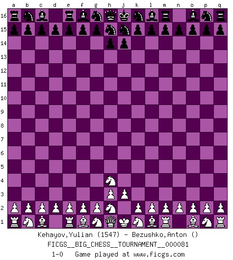Last move : 1-0 2011 October 1 7:15:47 [Event "FICGS__BIG_CHESS__TOURNAMENT__000081"] [Site "FICGS"] [Date "2011.09.30"] [Round "1"] [White "Kehayov,Yulian"] [Black "Bezushko,Anton"] [Result "1-0"] [WhiteElo "1547"] [BlackElo ""] 1.j2-h4 1-0 Follow this game move after move (download)Bobby Fischer is the greatest Chess genius of all time ! (Alexander Kotov) Ein Teil des Fehlers ist immer korrekt. (Savielly Grigorievitsch Tartakower) Dejen al perfeccionista jugar por correo. (Yasser Seirawan) Donnez-moi un Cavalier en 6e et je gagnerais toutes mes parties. (Steinitz) The ego is not master in its own house. (Sigmund Freud)