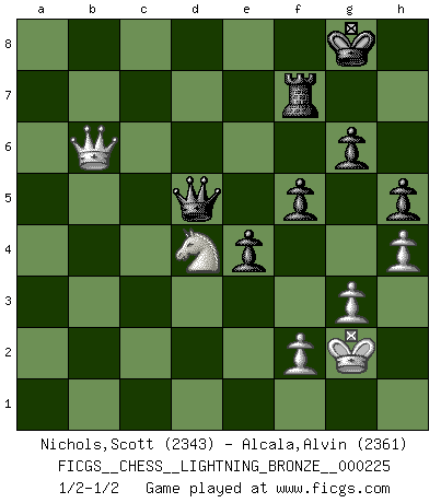Last move : 1/2-1/2 2011 October 1 19:53:10 [Event "FICGS__CHESS__LIGHTNING_BRONZE__000225"] [Site "FICGS"] [Date "2011.10.01"] [Round "1"] [White "Nichols,Scott"] [Black "Alcala,Alvin"] [Result "1/2-1/2"] [WhiteElo "2343"] [BlackElo "2361"] 1.e4 c5 2.Nf3 d6 3.d4 cxd4 4.Nxd4 Nf6 5.Nc3 a6 6.g3 e5 7.Nf3 Be7 8.Be3 O-O 9.Bg2 Be6 10.Nh4 g6 11.Nd5 Nxd5 12.exd5 Bc8 13.Nf3 Qc7 14.Nd2 Nd7 15.O-O f5 16.Qe2 b6 17.Nf3 Bf6 18.Ng5 Nc5 19.Rfd1 e4 20.c3 Re8 21.Bf1 b5 22.Qd2 Rb8 23.Be2 Qb7 24.h4 Na4 25.Rab1 Be5 26.Kg2 Qg7 27.Rh1 h5 28.Rhc1 Bd7 29.Rc2 Rb7 30.c4 b4 31.c5 Nxc5 32.Rxc5 dxc5 33.Bxa6 Ra7 34.Bc4 Bd6 35.a3 Rb8 36.axb4 Rxb4 37.Ne6 Qe7 38.b3 Bb5 39.Rc1 Bxc4 40.Rxc4 Rxc4 41.bxc4 Qf6 42.Bxc5 Bxc5 43.Nxc5 Qb6 44.Ne6 Qb3 45.Nd4 Qxc4 46.Qb2 Rf7 47.Qb6 Qxd5 1/2-1/2 Sicilian : Najdorf, Zagreb (Fianchetto) variation Kingside Castling by player Black (move 8) Kingside Castling by player White (move 15) This chess game ended in a draw. Follow this game move after move (download)Place the contents of the Chess box in a hat, shake them up vigorously, pour them on the board from a height of two feet, and you get the style of Steinitz. (H. E. Bird) Jeder leidlich begabte Spieler, er braucht keineswegs hervorragend veranlagt zu sein, kann es zum Meister bringen. Aber das ist ja auch gar nicht nötig! Der richtige Standpunkt ist es, zu seinem Vergnügen zu spielen, und man glaube ja nicht, dass der Genuss proportional dem Können sei. (Siegbert Tarrasch) Coloca el contenido de las piezas del Ajedrez en un sombrero, agitalo vigorosamente, arrojalas en un tablero desde una altura de 30 centimetros y así obtendras el estilo de Steinitz. (H. E. Bird) On entre au jeu d'Echecs comme on entre en Religion. Pour le joueur d'Echecs, la partie d'Echecs c'est l'office, la messe, le défilé du 1er Mai, le dépôt de gerbe au Monument aux Morts. C'est un drame sacré. (Michel Roos) When you don't know what to do, walk fast and look worried. (Anonymous)