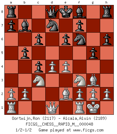 Last move : 1/2-1/2 2011 November 10 13:38:14 [Event "FICGS__CHESS__RAPID_M__000048"] [Site "FICGS"] [Date "2011.10.02"] [Round "1"] [White "Oortwijn,Ron"] [Black "Alcala,Alvin"] [Result "1/2-1/2"] [WhiteElo "2117"] [BlackElo "2189"] 1.d4 Nf6 2.c4 c6 3.Nc3 d5 4.Nf3 e6 5.Bg5 h6 6.Bh4 dxc4 7.e4 g5 8.Bg3 b5 9.Be2 Bb7 10.O-O Nbd7 1/2-1/2 Queen's pawn game Kingside Castling by player White (move 10) This chess game ended in a draw. Follow this game move after move (download)Chess is like war on a board. (Bobby Fischer) Zeige mir drei Eröffnungsvarianten und ich beweise dir, dass zwei davon inkorrekt sind. (Emanuel Lasker) El Ajedrez es realmente noventa y nueve por ciento calculación. (Soltis) Horreur, mais aussi harmonie suprême : qu'y avait-il en effet au monde en dehors des échecs ? Le brouillard, l'inconnu, le non-être... (Vladimir Nabokov) It's not enough to succeed. Others must fail. (Gore Vidal)