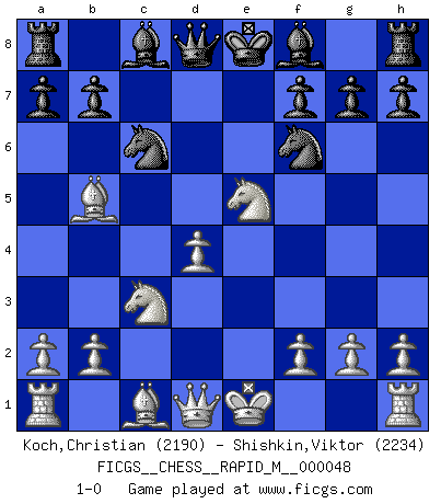 Last move : 1-0 2011 November 21 1:18:42 [Event "FICGS__CHESS__RAPID_M__000048"] [Site "FICGS"] [Date "2011.10.02"] [Round "1"] [White "Koch,Christian"] [Black "Shishkin,Viktor"] [Result "1-0"] [WhiteElo "2190"] [BlackElo "2234"] 1.e4 c5 2.c3 d5 3.exd5 Qxd5 4.d4 Nf6 5.Nf3 cxd4 6.cxd4 e5 7.Nc3 Qd8 8.Bb5+ Nc6 9.Nxe5 1-0 This chess game has been lost on time (started : 2011.10.02 0:4:25) Sicilian : Alapin's variation (2.c3) Player White won this chess game. Follow this game move after move (download)Adequate compensation for a sacrifice is having a sound combination leading to a winning position; adequate compensation for a blunder is having your opponent snatch defeat from the jaws of victory. (Bruce A. Moon) Ich kenne keine einzige Person, die behaupten würde, Garri Kasparow sei ein guter Mensch (Nigel Short) Un jugador que es sorprendido, esta derrotado a medias. (Proverbio) Le jeu d'échecs est comme rejeté hors du temps. (Antoine de Saint-Exupéry) Philosophers use a language that is already deformed as though by shoes that are too tight. (Ludwig Wittgenstein)