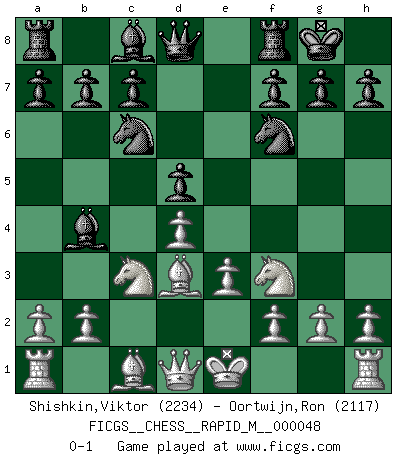 Last move : 0-1 2011 November 25 2:1:6 [Event "FICGS__CHESS__RAPID_M__000048"] [Site "FICGS"] [Date "2011.10.02"] [Round "1"] [White "Shishkin,Viktor"] [Black "Oortwijn,Ron"] [Result "0-1"] [WhiteElo "2234"] [BlackElo "2117"] 1.d4 Nf6 2.c4 e6 3.Nc3 Bb4 4.e3 O-O 5.Nf3 d5 6.cxd5 exd5 7.Bd3 Nc6 0-1 This chess game has been lost on time (started : 2011.10.02 0:4:25) Nimzo-Indian : 4.e3 e8g8, 5.Nf3 d7d5 Kingside Castling by player Black (move 4) Player Black won this chess game. Follow this game move after move (download)Of all my Russian books, the defense contains and diffuses the greatest 'warmth' which may seem odd seeing how supremely abstract Chess is supposed to be. (Vladimir Nabokov) Schach wird sich dank seiner hohen kulturellen Tradition immer durchsetzen. In näherer Zukunft womöglich sogar als Gegenreaktion auf die maßlose Reizüberflutung im Freizeit- und Spielbereich. (Garry Kasparov) El Ajedrez es tortura mental. (Garry Kasparov) La conception d'un plan est le processus par lequel un joueur exploite les avantages de sa position tout en s'efforçant d'en réduire au minimum les inconvénients. Afin de garantir le succès, un plan doit toujours se fonder sur un diagnostic objectif des particularités d'une position. La conception d'un plan est d'autant plus difficile que la position est équilibrée, et grandement facilitée lorsqu'il n'existe qu'un seul plan susceptible de répondre aux exigences de la position. (Harry Golombek) Man is still the most extraordinary computer of all. (John F. Kennedy)