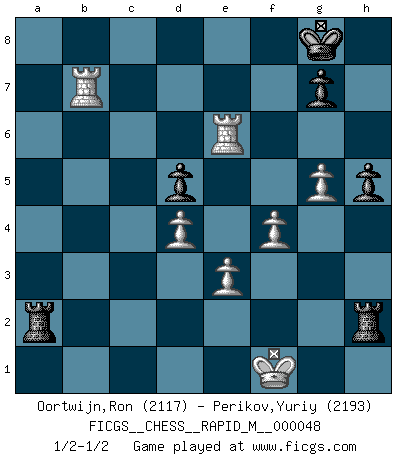 Last move : 1/2-1/2 2012 January 31 10:38:16 [Event "FICGS__CHESS__RAPID_M__000048"] [Site "FICGS"] [Date "2011.10.02"] [Round "1"] [White "Oortwijn,Ron"] [Black "Perikov,Yuriy"] [Result "1/2-1/2"] [WhiteElo "2117"] [BlackElo "2193"] 1.d4 Nf6 2.c4 e6 3.Nc3 d5 4.cxd5 exd5 5.Bg5 c6 6.Qc2 Bd6 7.e3 O-O 8.Nf3 h6 9.Bh4 Be6 10.Bd3 Nbd7 11.O-O Rc8 12.a3 Qc7 13.Rfc1 Rfe8 14.b4 Ng4 15.h3 Ngf6 16.Ne2 Nh5 17.g4 Nhf6 18.Nd2 a5 19.Bg3 Bxg3 20.Nxg3 Qd8 21.Ne2 h5 22.g5 Ne4 23.h4 Bf5 24.Nxe4 Bxe4 25.bxa5 Qxa5 26.Nf4 Nf8 27.Rab1 Qxa3 28.Bxe4 Rxe4 29.Qb3 Qxb3 30.Rxb3 Ne6 31.Nxe6 Rg4+ 32.Kf1 Rxh4 33.Rc2 fxe6 34.Rxb7 Rg4 35.f4 Ra8 36.Rxc6 Ra1+ 37.Kf2 Ra2+ 38.Kf1 R4g2 39.Rxe6 Rh2 1/2-1/2 Queen's pawn game Kingside Castling by player Black (move 7) Kingside Castling by player White (move 11) This chess game ended in a draw. Follow this game move after move (download)Chess demands total concentration. (Bobby Fischer) Ich kenne Menschen, die allen Willen der Welt besitzen und doch nicht Schach spielen können. (Robert James Fischer) ¿Esta Bobby Fischer algo cuerdo?. (Salo Flohr) Toutes les manuvres exécutées sur une colonne ouverte ont pour but ultime l'intrusion définitive sur la septième ou la huitième rangée, en plein cur de la position ennemie. (Aaron Nimzovitch) It is the aim of the modern school, not to treat every position according to one general law, but according to the principle inherent in the position. (Richard Reti)